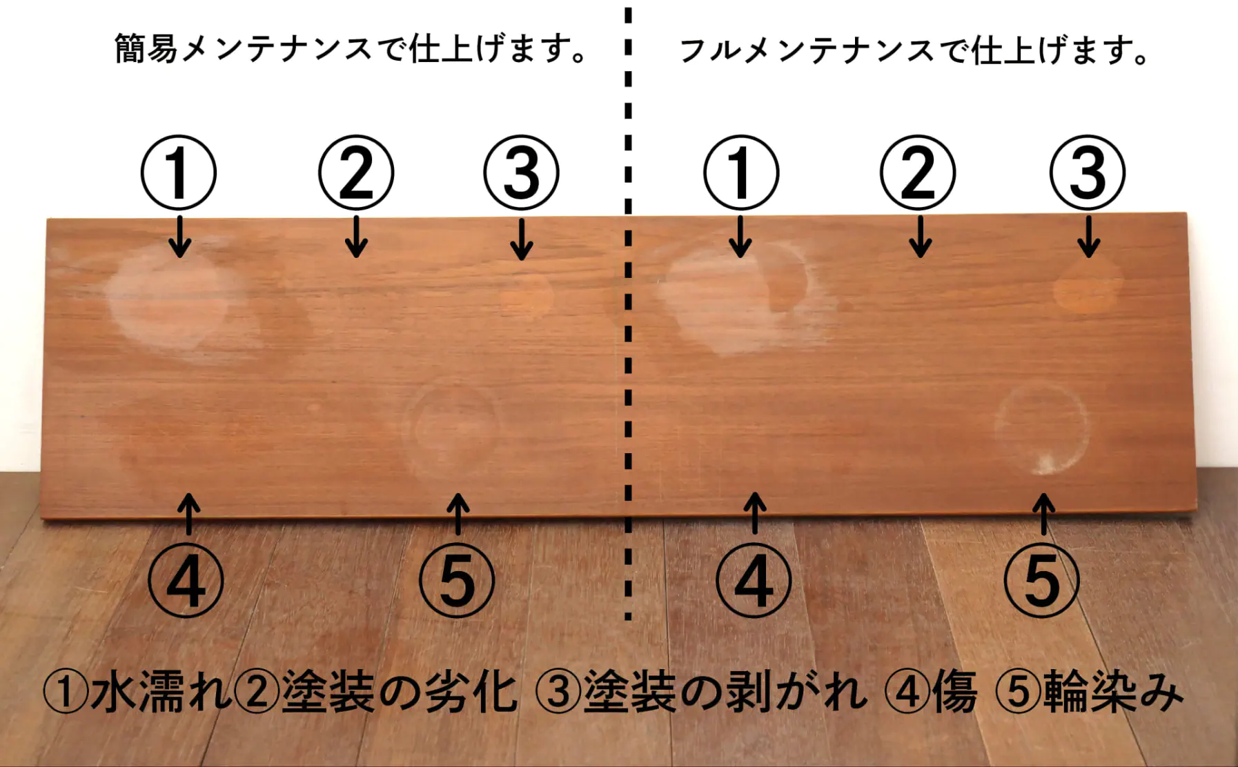 ここまでフルメンテナンスと簡易メンテナンスの違いをご説明いたしました。フルメンテナンスを行えばシミや小傷は可能な限り除去可能で木の質感も楽しめるきれい目な仕上がりとなります。簡易メンテナンスの場合は元々の塗装やシミ、小傷は残ることが多いですがヴィンテージ感のある仕上がりが魅力です。