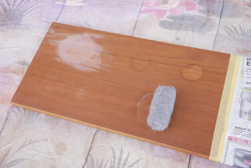 ヘラやブラシなどで剥離剤を可能な限り取り除きました。この時点でシミや色むらなど除去できましたが、表面の小傷はまだ残っています。次は研磨工程です。
