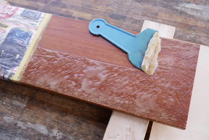 古い塗装を剥がすために一度剥離します。コンディションによっては研磨から入りますがこちらの棚板は塗膜が厚めの為、剥離からとなります。
