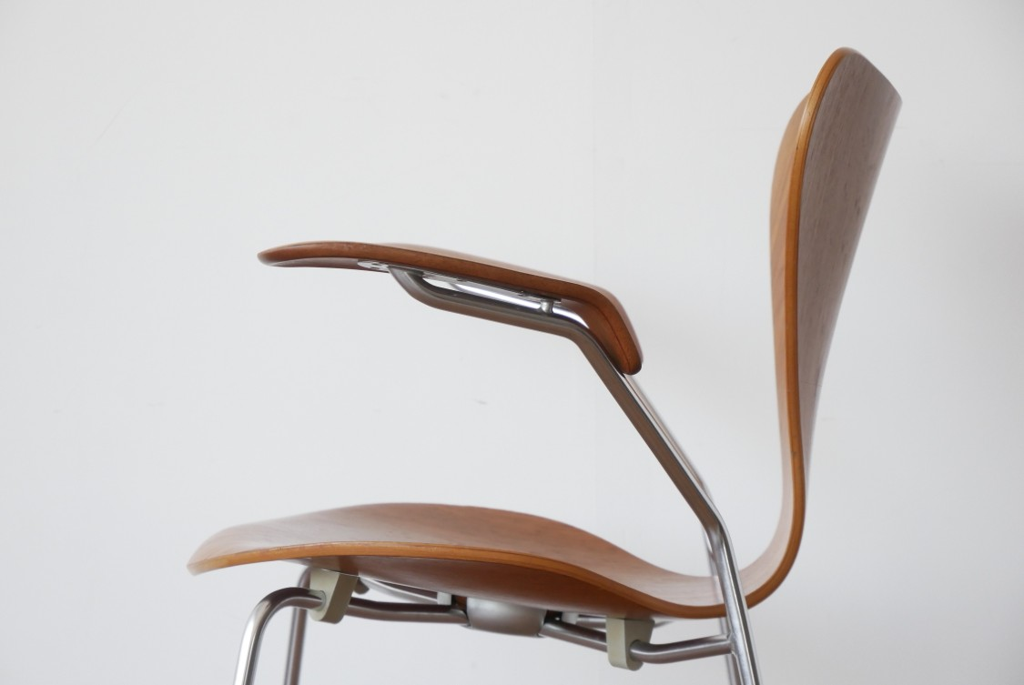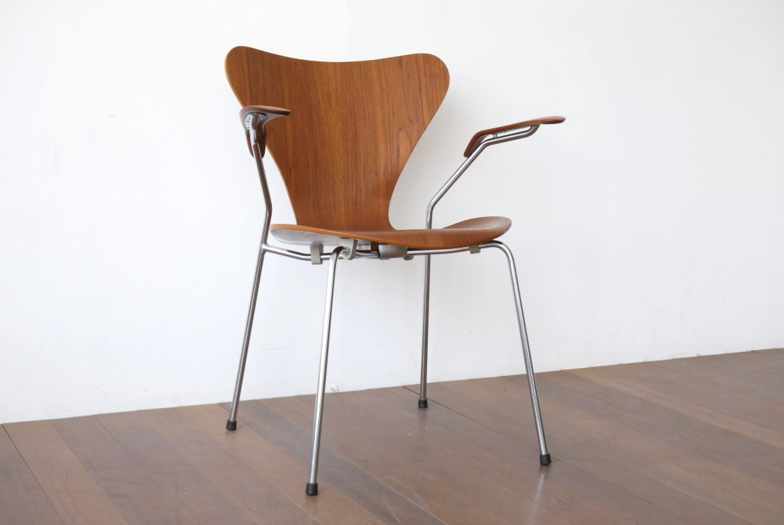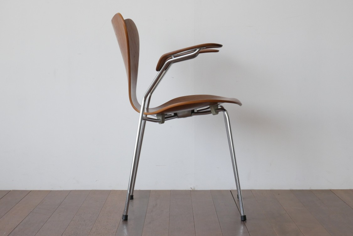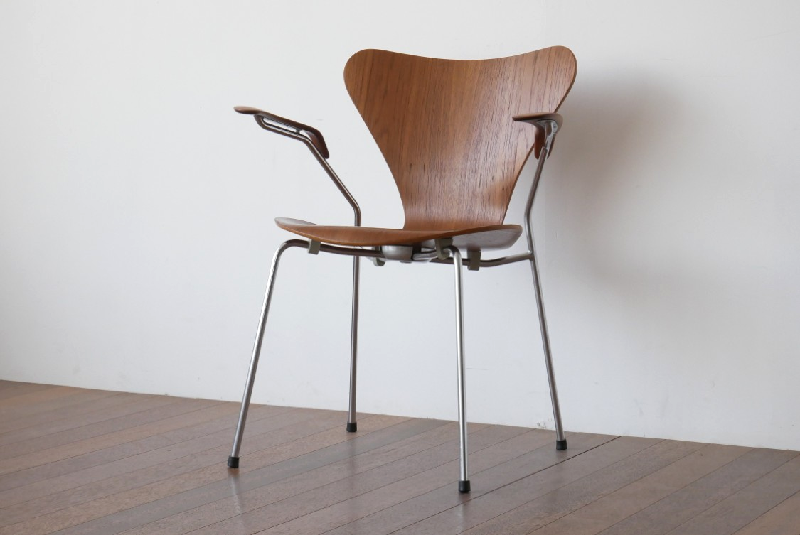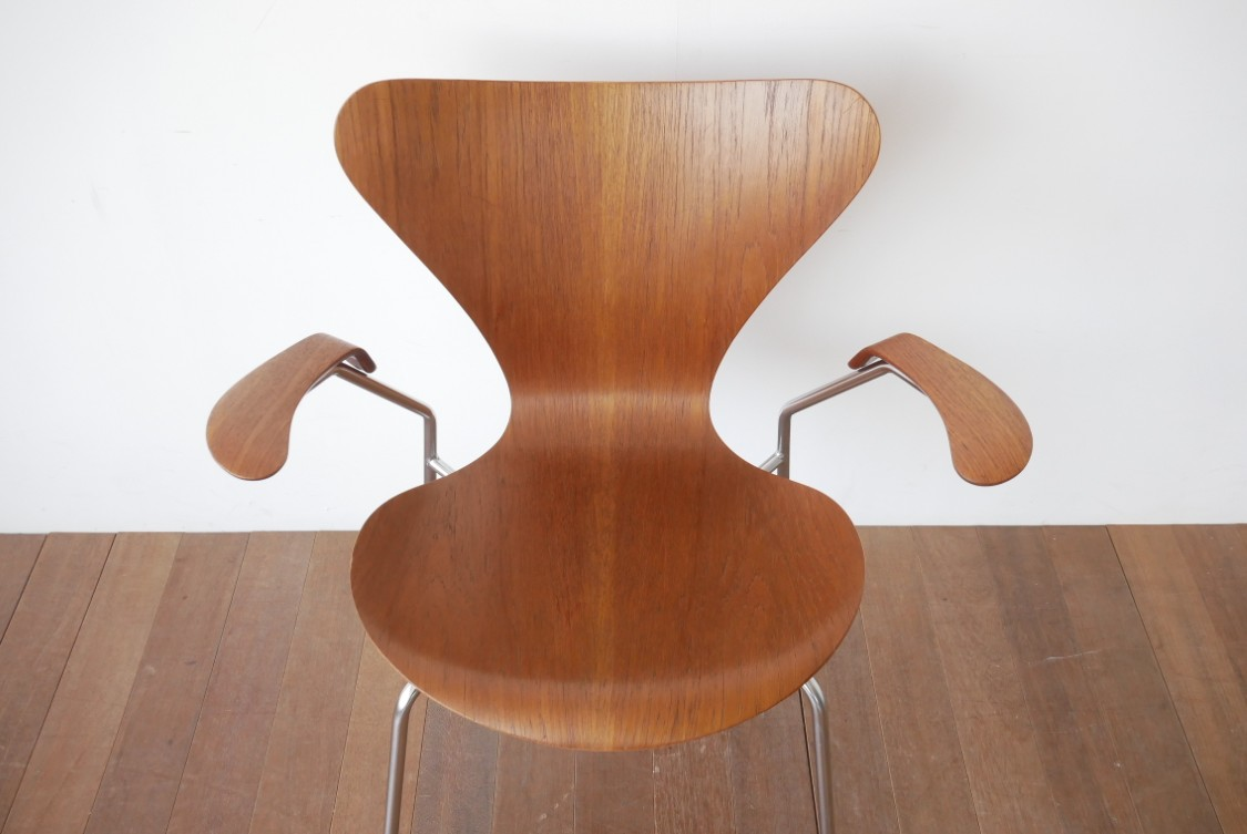 コメント デンマークで買い付けたアルネ・ヤコブセンのアーム付きセブンチェアFH3107。北欧ヴィンテージのチェアとして定番中の定番の作品ですが、アーム付きの流通数は限られ貴重。座り心地のよさも言わずもがなで、ダイニングチェアとしてはもちろんデスクワーク用としても重宝します。こちらはチーク材仕様となっており、経年変化のヴィンテージ感たっぷりな雰囲気が良い一脚です
