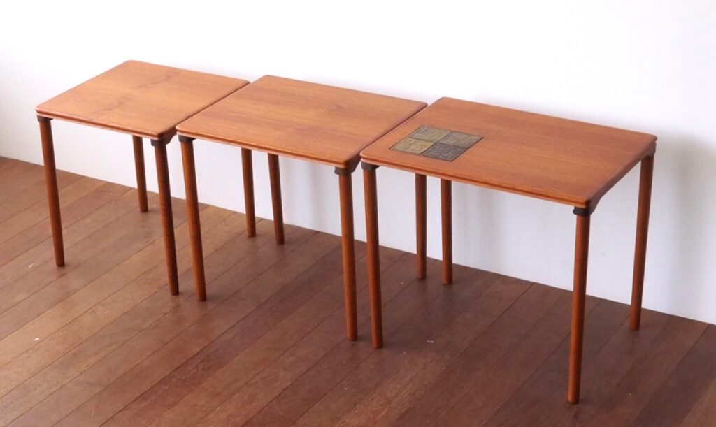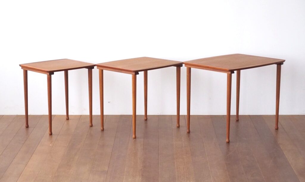 当店でよく買い付ける北欧ビンテージ家具のネストテーブル。まずはその見た目の美しさも魅力の一つ。3つ並べたときの美しさにほれぼれしてしまいます。商品を紹介するページでもついついその美しさをお伝えしたくてたくさん掲載してしまいますので、ここでもたくさん載せたいと思います。