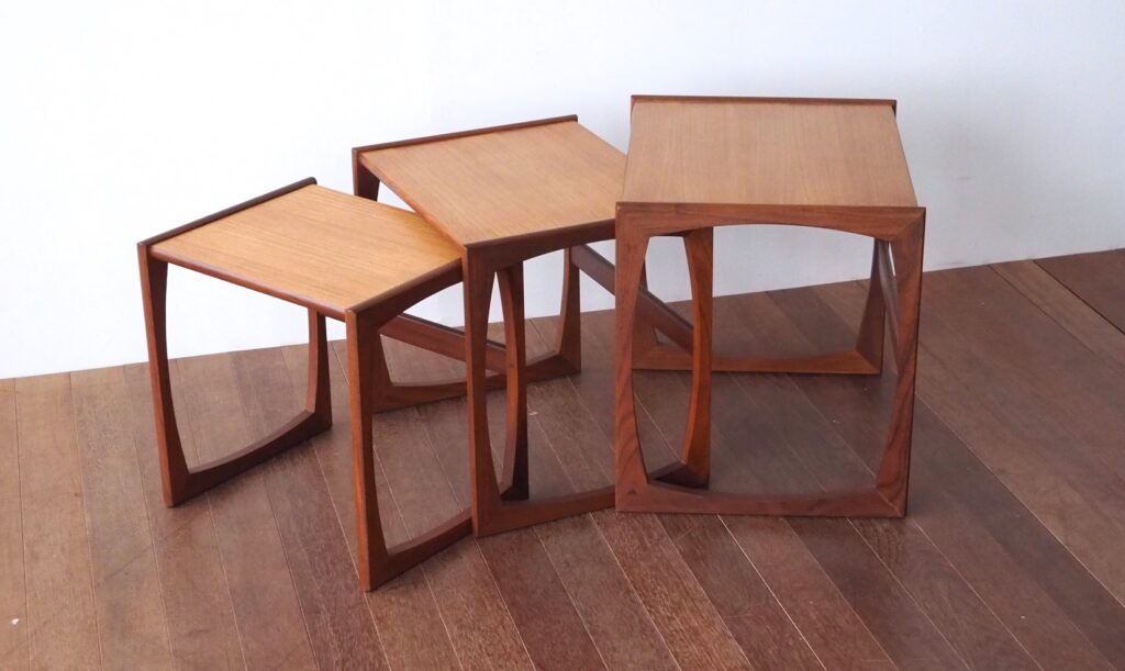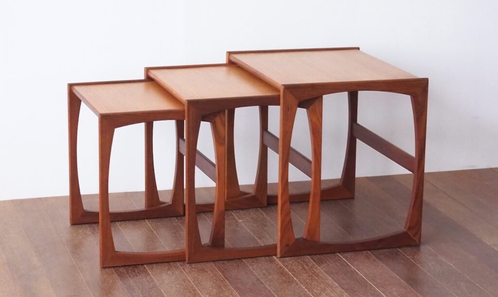 当店ではデンマーク製のものと、イギリス製ではG planやercol社のネストテーブルをよく買い付けます。ネストテーブルは北欧家具以外にも存在しますが、ビンテージの北欧家具はやはりシンプルで飽きのこないデザインのものが多く、いろいろなお部屋の雰囲気に合わせやすいと思います。
