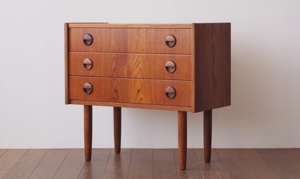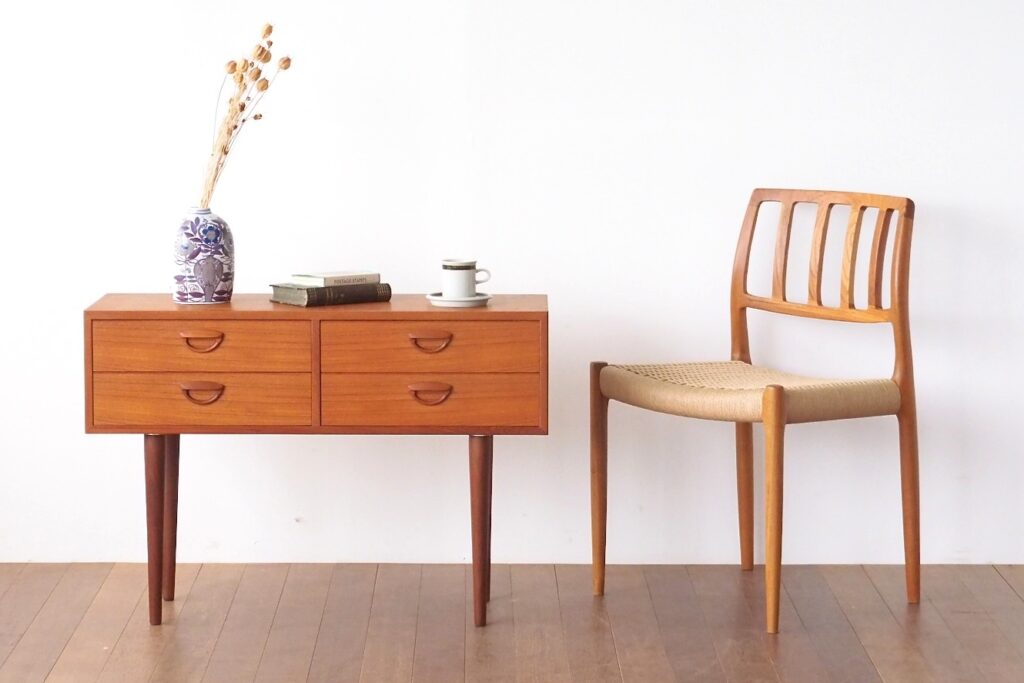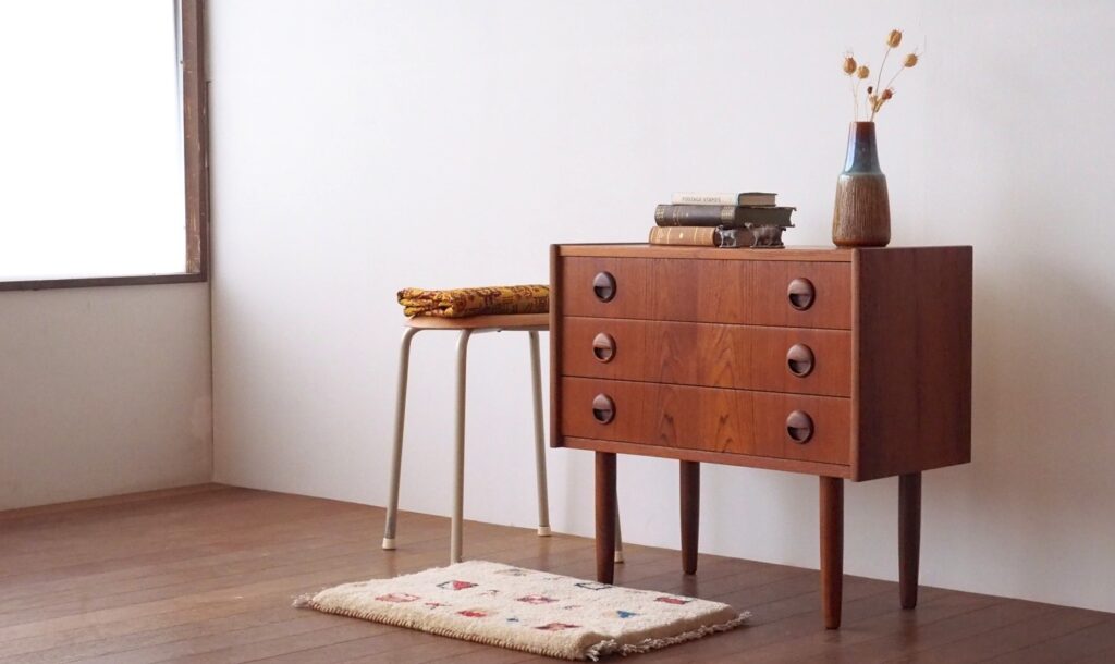 他の北欧ビンテージ家具に比べサイドチェストの中心価格は3~5万円ほどと比較的安価なのも魅力の一つ。もちろんハンス・j・ウェグナーやヨハネス・アンダーセンなどのデザイナー物は高価になりますが、比較的安価なものもたくさんあります。価格差の要因としては、取手や細かな部分の作りや大きさ、材の違いによるもの。高価なものほど細かな造りこみが見受けられます。小さくても作りこまれたサイドチェストは、大型家具にも負けない繊細で美しい魅力を持っています。価格的にも北欧ビンテージ家具の第一歩としておすすめです。