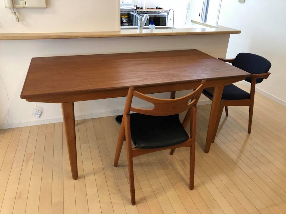 ダイニングテーブルの天板はウレタン加工、ウェグナーCH-29とカイ・クリスチャンセンのNo.42と共にお届け。