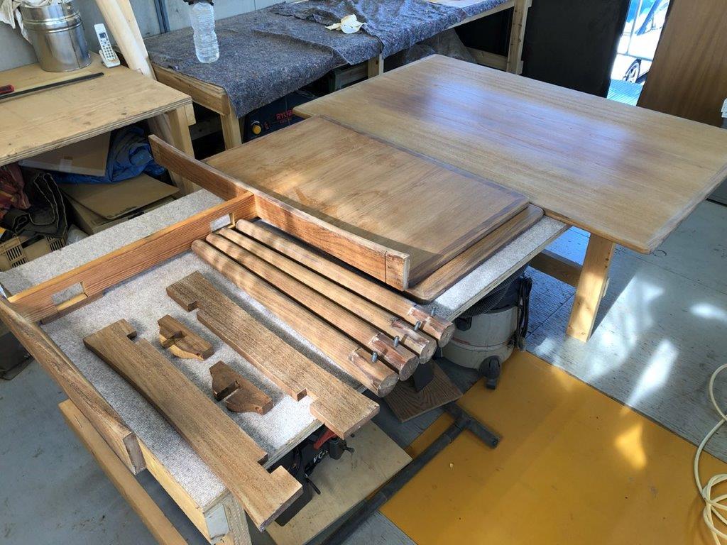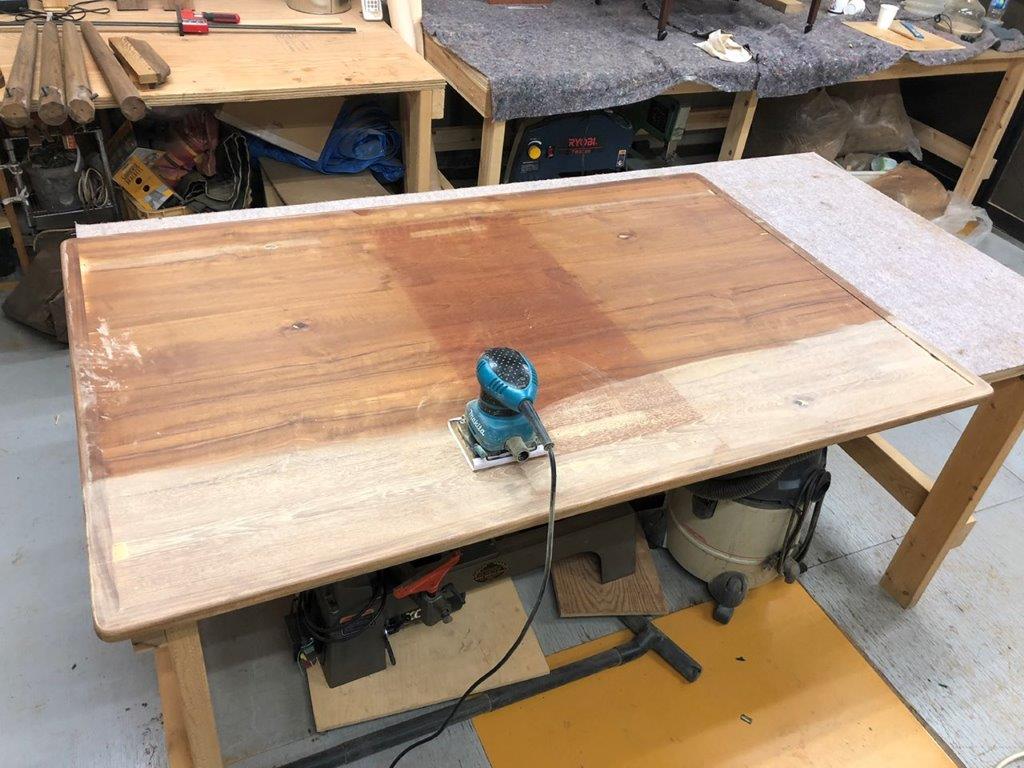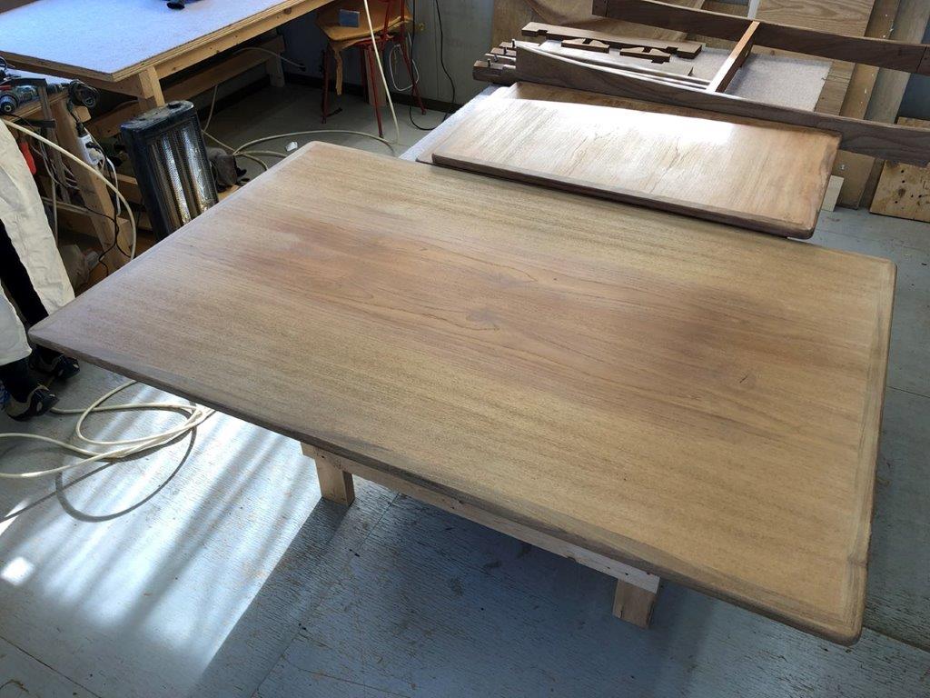 次は塗装。ダイニングテーブルはオイルウレタン仕上げを行いました。