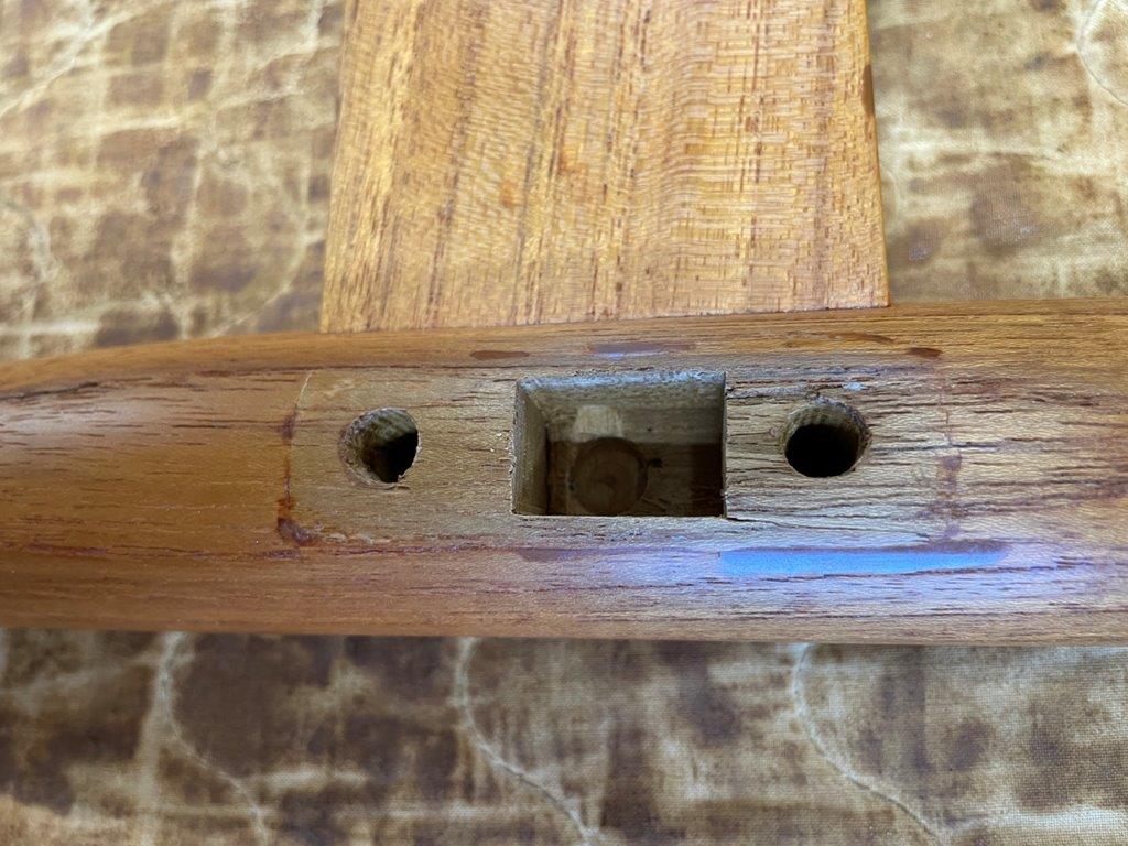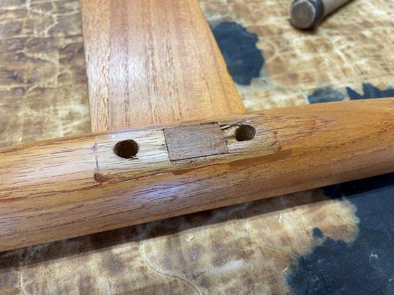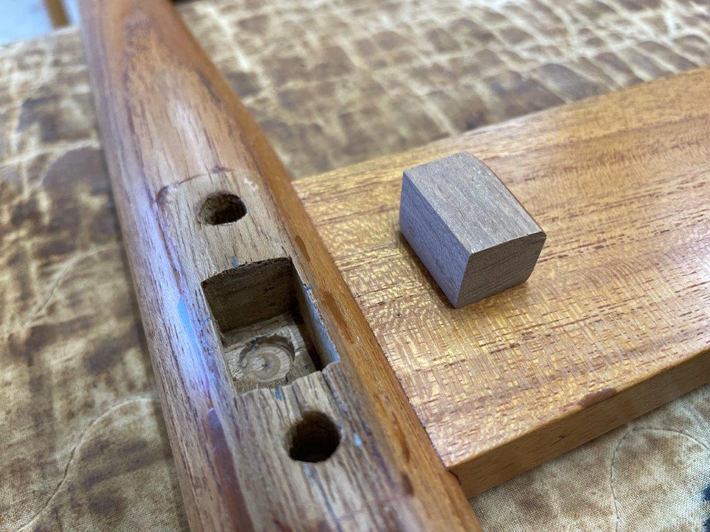 角のみがあれば一発で掘れるのですが機械がないので手作業で加工、同じチーク材を埋め込みました。