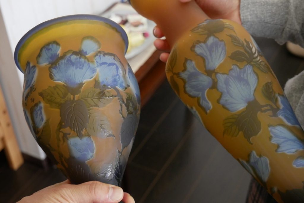 Hさん(旦那様):手仕事感といえば、こちらのガレコレクションの作品も集めていた時期があって、これもその職人さんによって葉っぱ一筋の描き方から異なるのが面白いと思っています。こだわっているポイントが職人さんごとに違うようで、青木蓮とか藤の花とか結構個性があって。