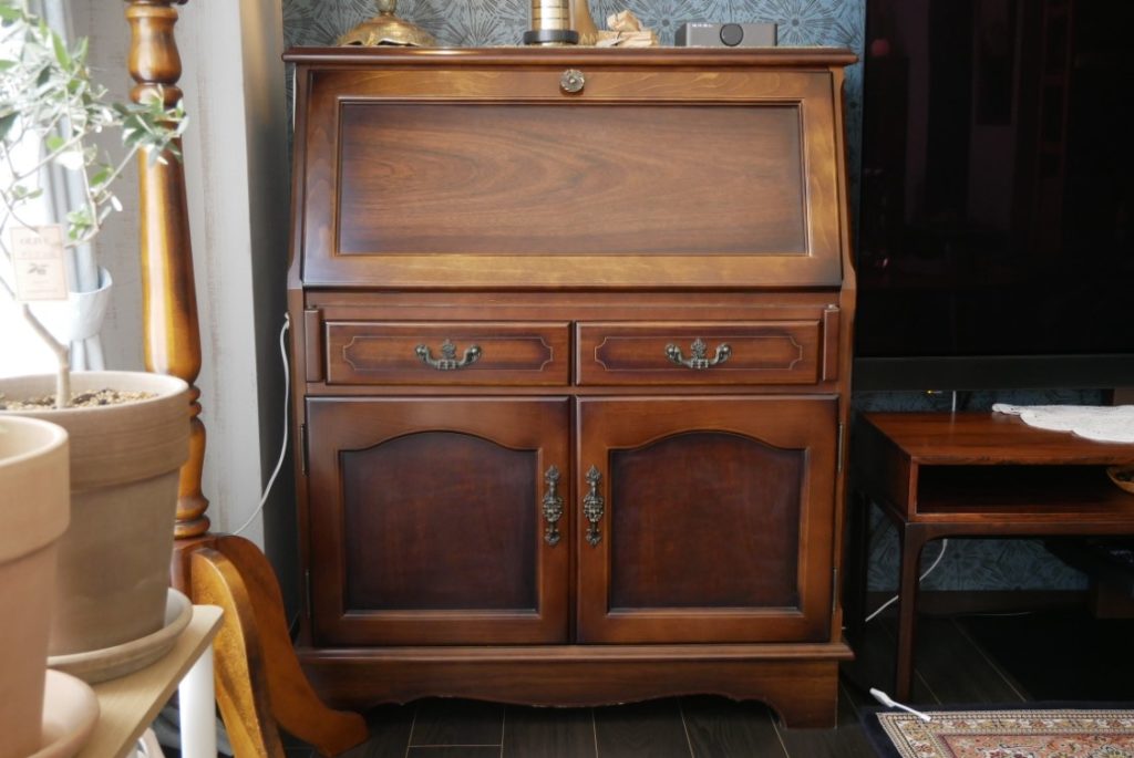 Hさん(奥様):このほかにも引き継いだものがいろいろあって、例えばちょっとかわいそうな感じになっているんですが笑、玄関の絨毯も実は祖父が勘違いしてお風呂マットで使ってしまっていたものを使用していたり、カリモクのビューローも祖父が使っていたものを譲ってもらったり。生前よくここで俳句をノートに書いていました。