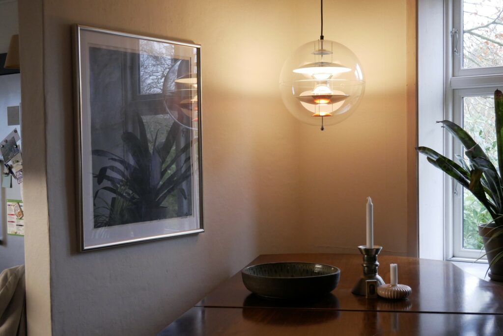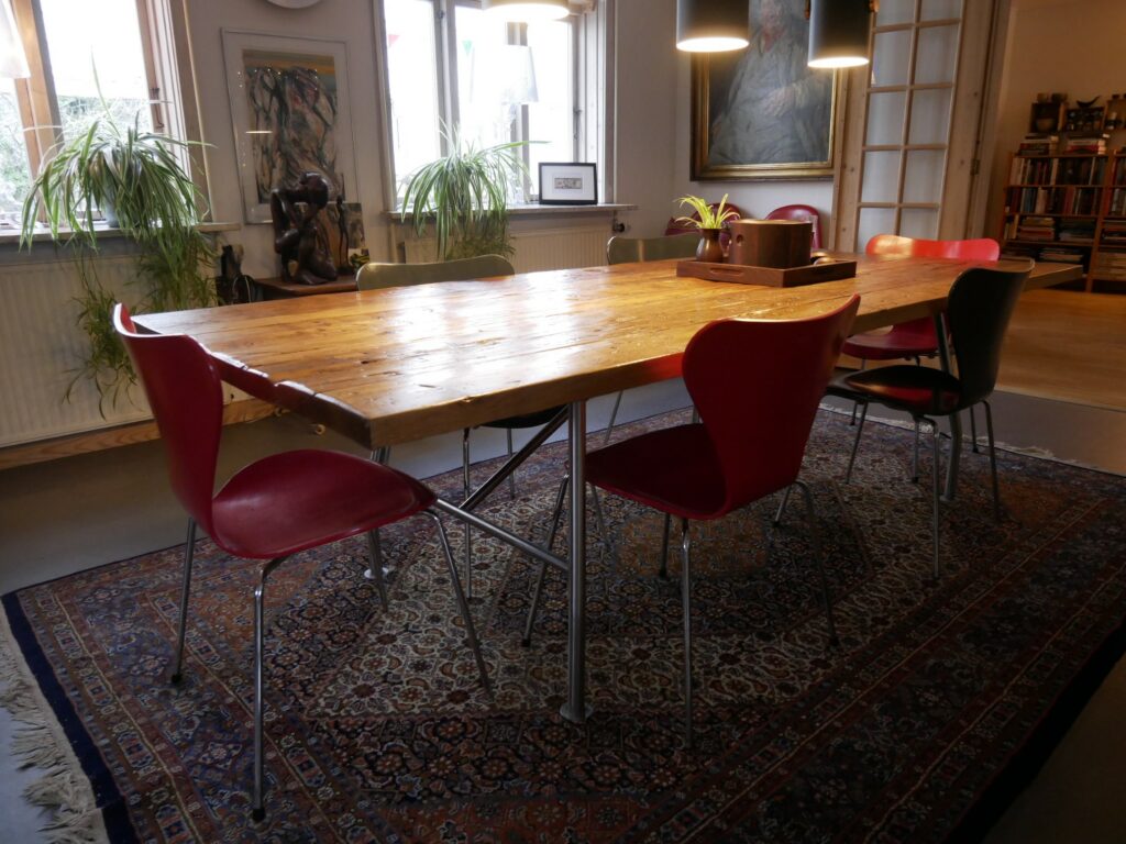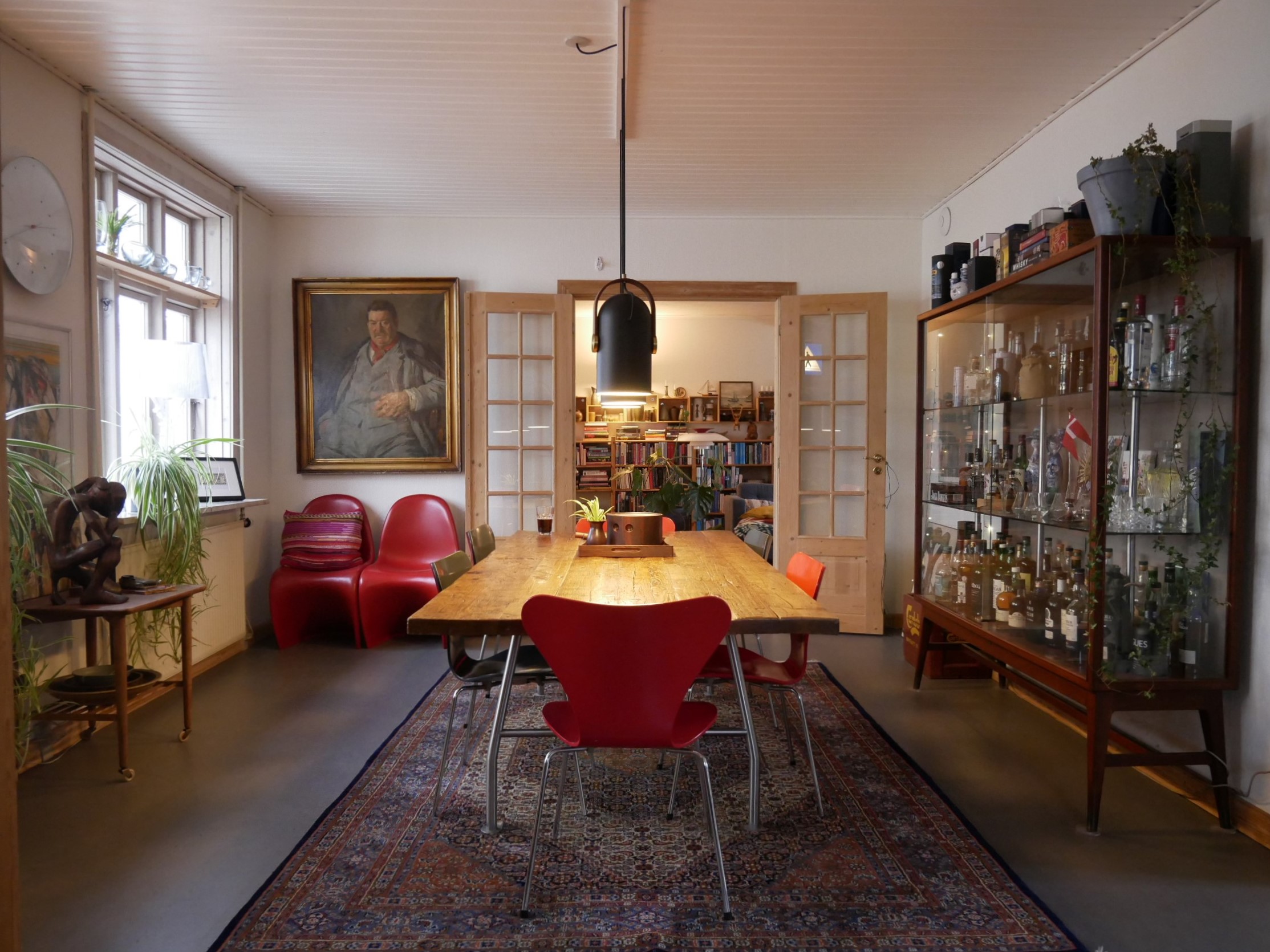 ホールの向かいはダイニングエリア。全体のバランスや配色、絵画やアートの取り入れ方、異なるテイストのものの組み合わせ、何から何までそのコーディネートセンスに脱帽。奥様が塗装をしたという古いテーブル天板に別のステンレス脚を取り付けてリメイクしたダイニングテーブルに赤いセブンチェアという構成。普通ならなかなか思いつかないコーディネートですが、パントンチェアや絨毯との絶妙なバランスによって、見事にまとめられています。照明はレクリントの CARRONADE を使用、空間をうまい具合に締めています。私自身も北欧ヴィンテージであればそのジャンルだけでコーディネートを考えてしまいますが、本当にデンマーク人はこのような異素材や異なるテイストのものの合わせ方がうまく勉強になります。