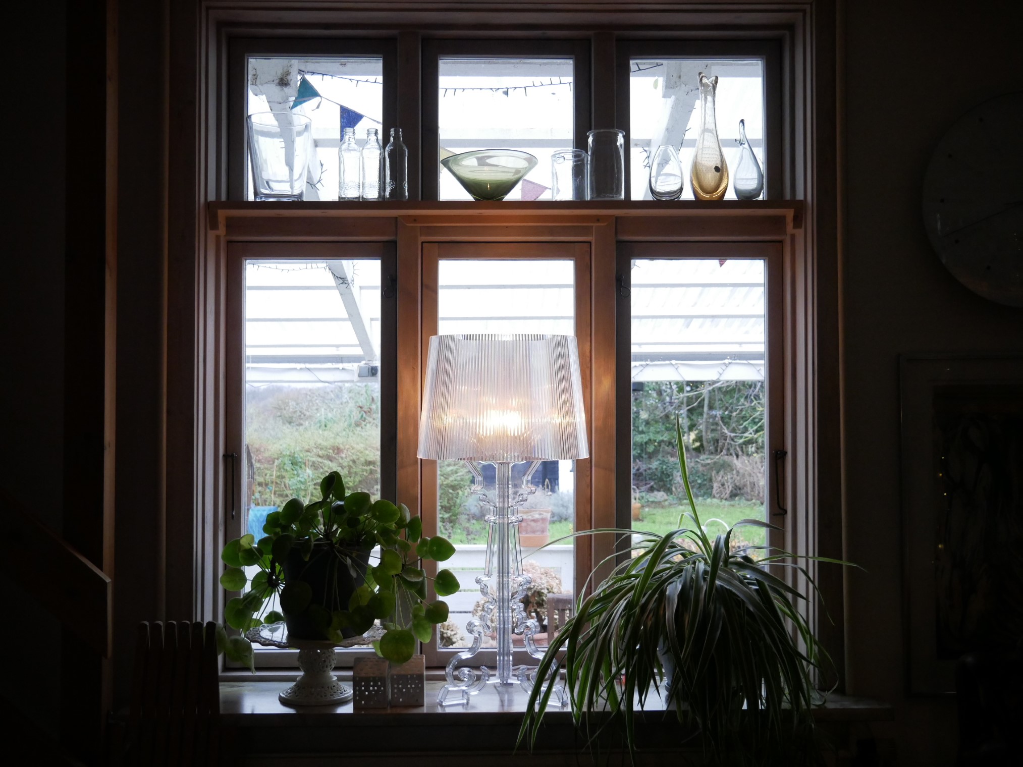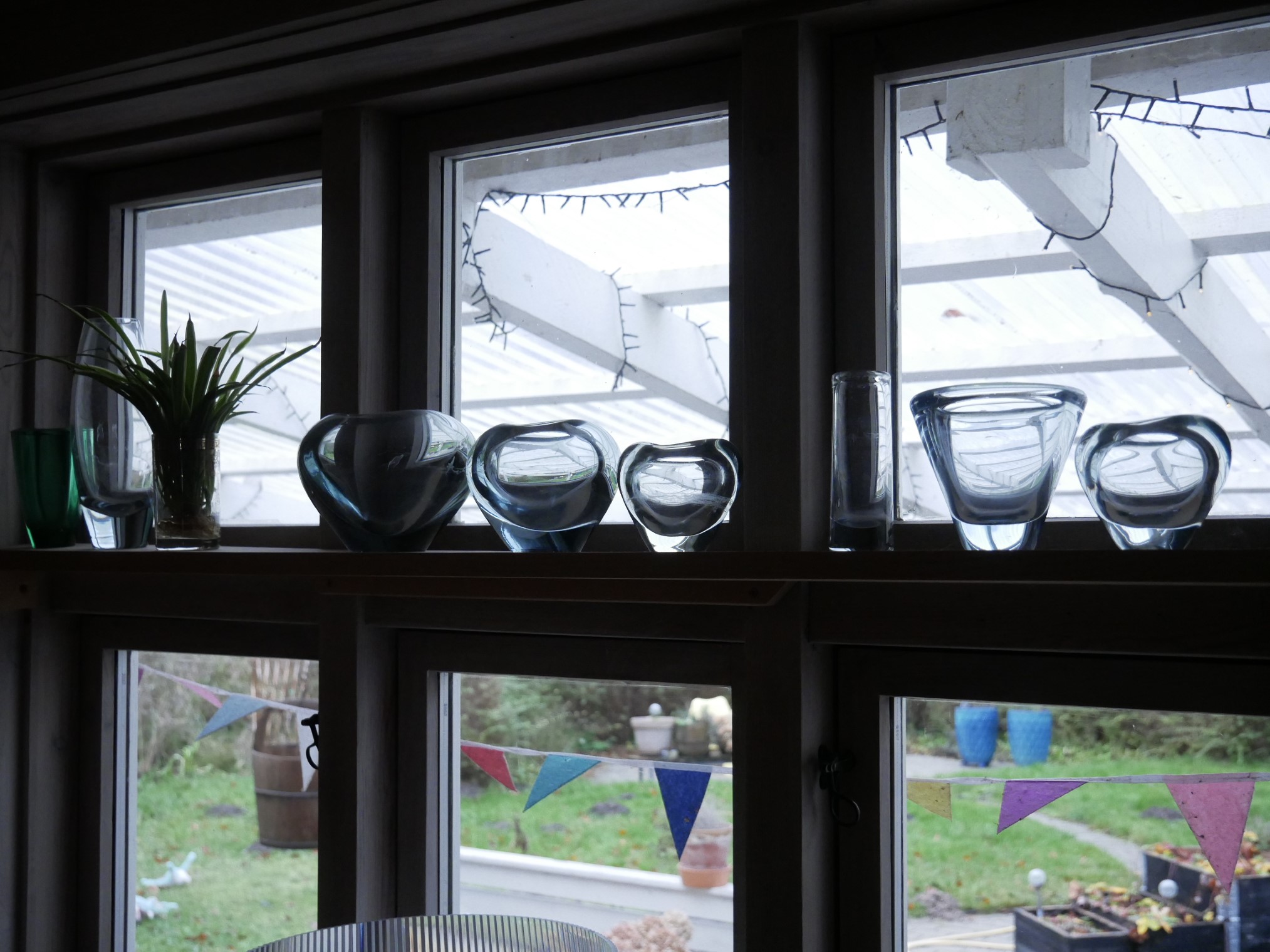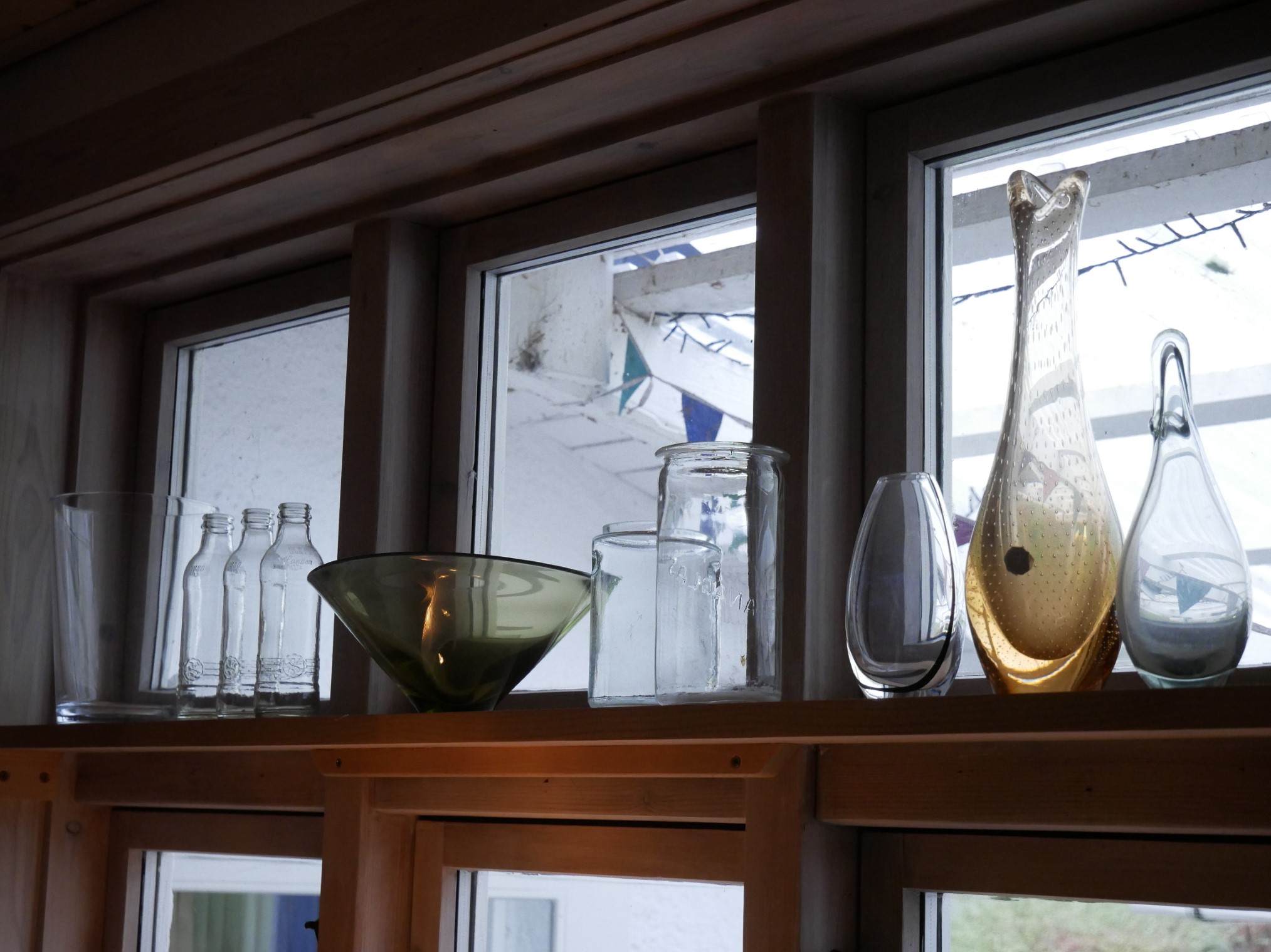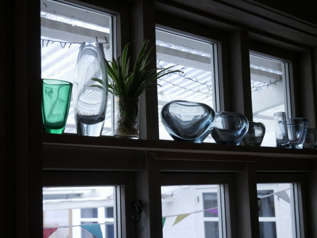 キャビネットの向かいのガラスの窓際にはホルムガードなどのガラス小物をコーディネート。他のお宅でも窓際や光が差し込むところにガラス小物を飾ってあるところをよく見かけます。 光を取り込みながら美しさを引き立たせています。