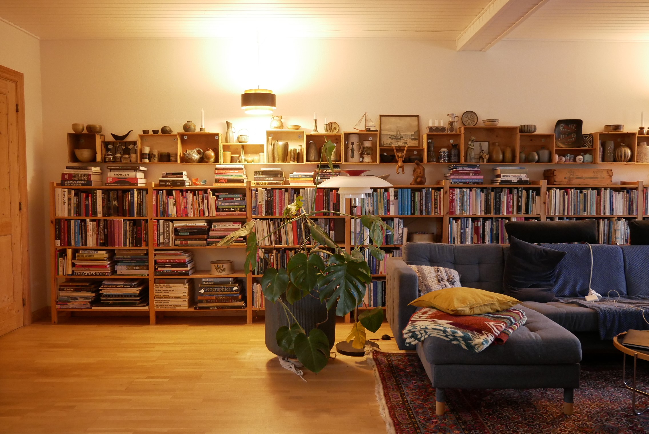 ダイニングエリアを抜けると大量の書籍とJ氏のコレクションであるベースが壁面にたくさん飾られているリビングエリア。