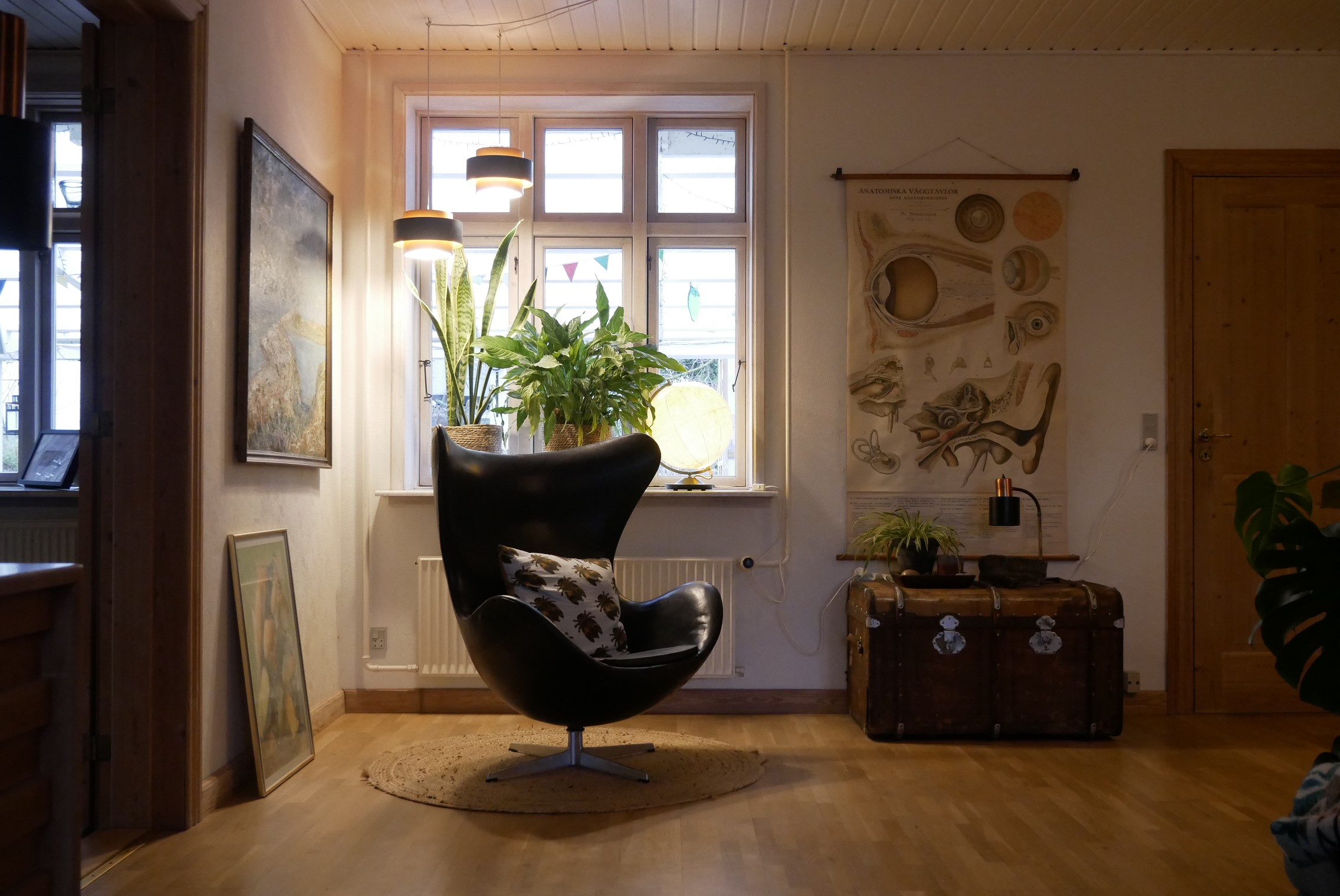 リビングエリアの一角にはアルネ・ヤコブセンのエッグチェア。愛犬にいたずらされてもいいように、ほどよいヤレ感のエッグを使用しているとのこと。このバランス感覚。