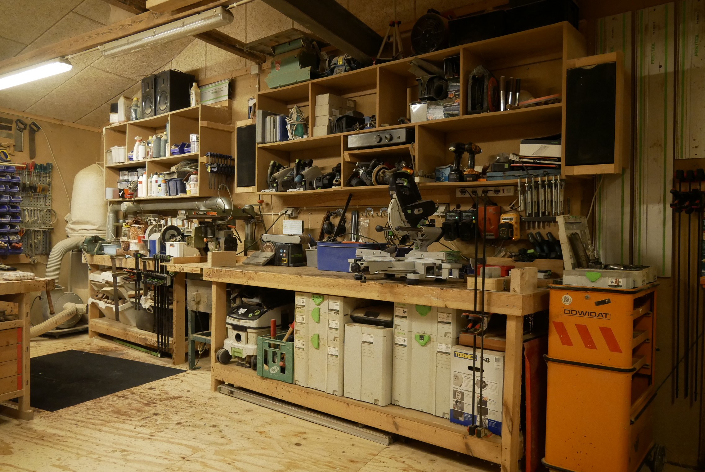 リビングを抜けるとJ氏の趣味である木工の作業場へ。個人の趣味としてはかなり本格的。