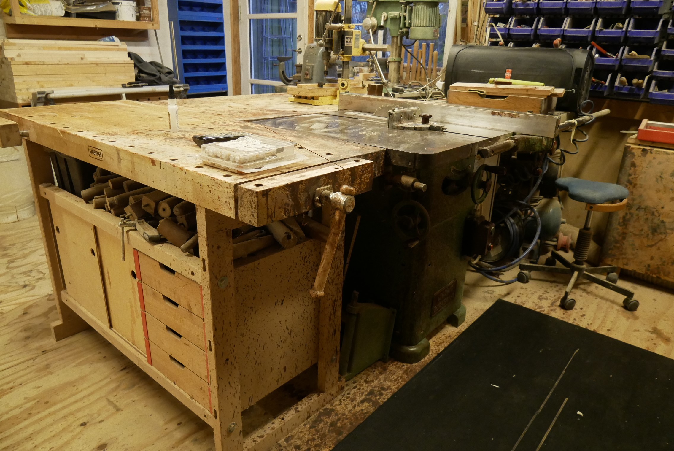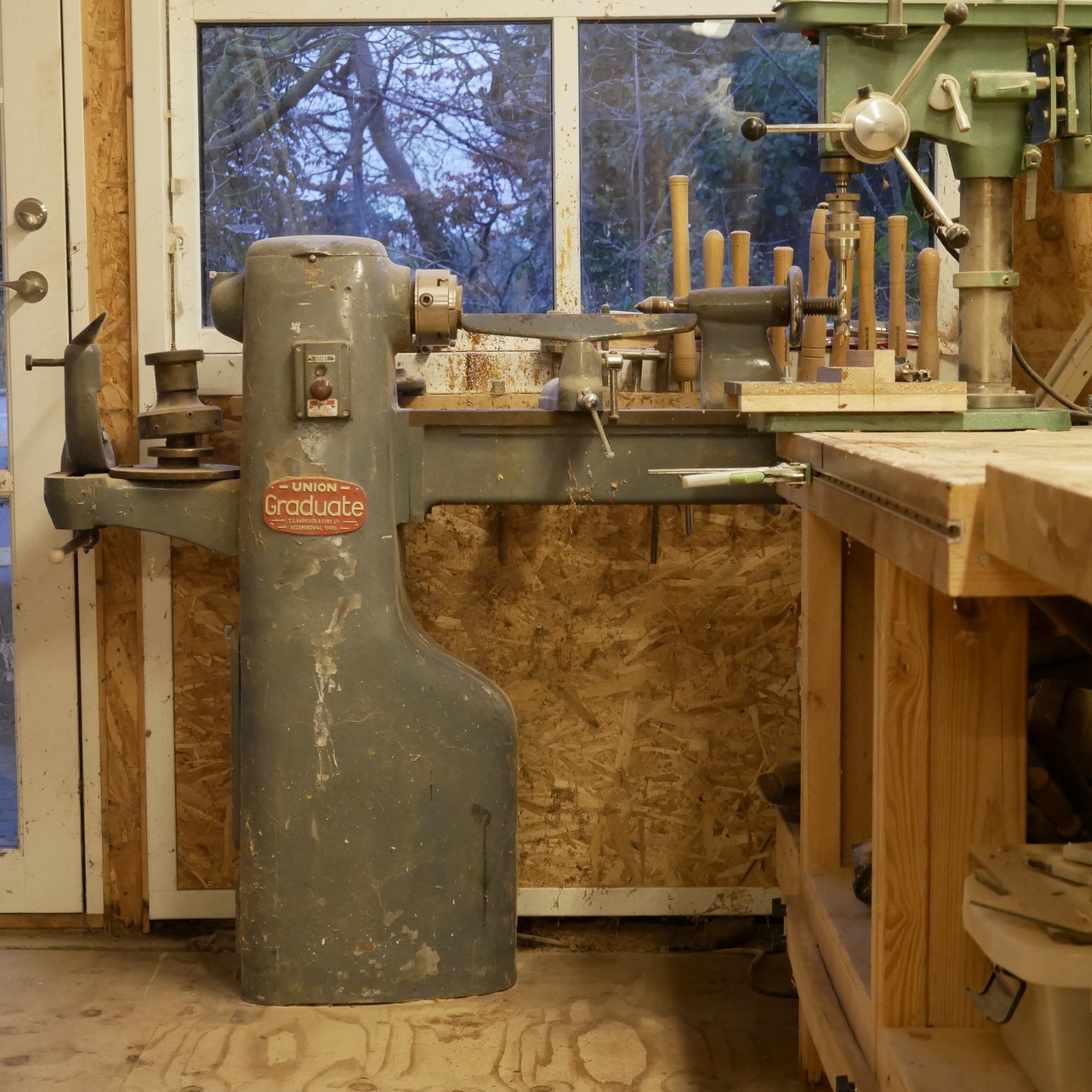 オークションで落札した木工旋盤も本格的。配送に苦労したそう。