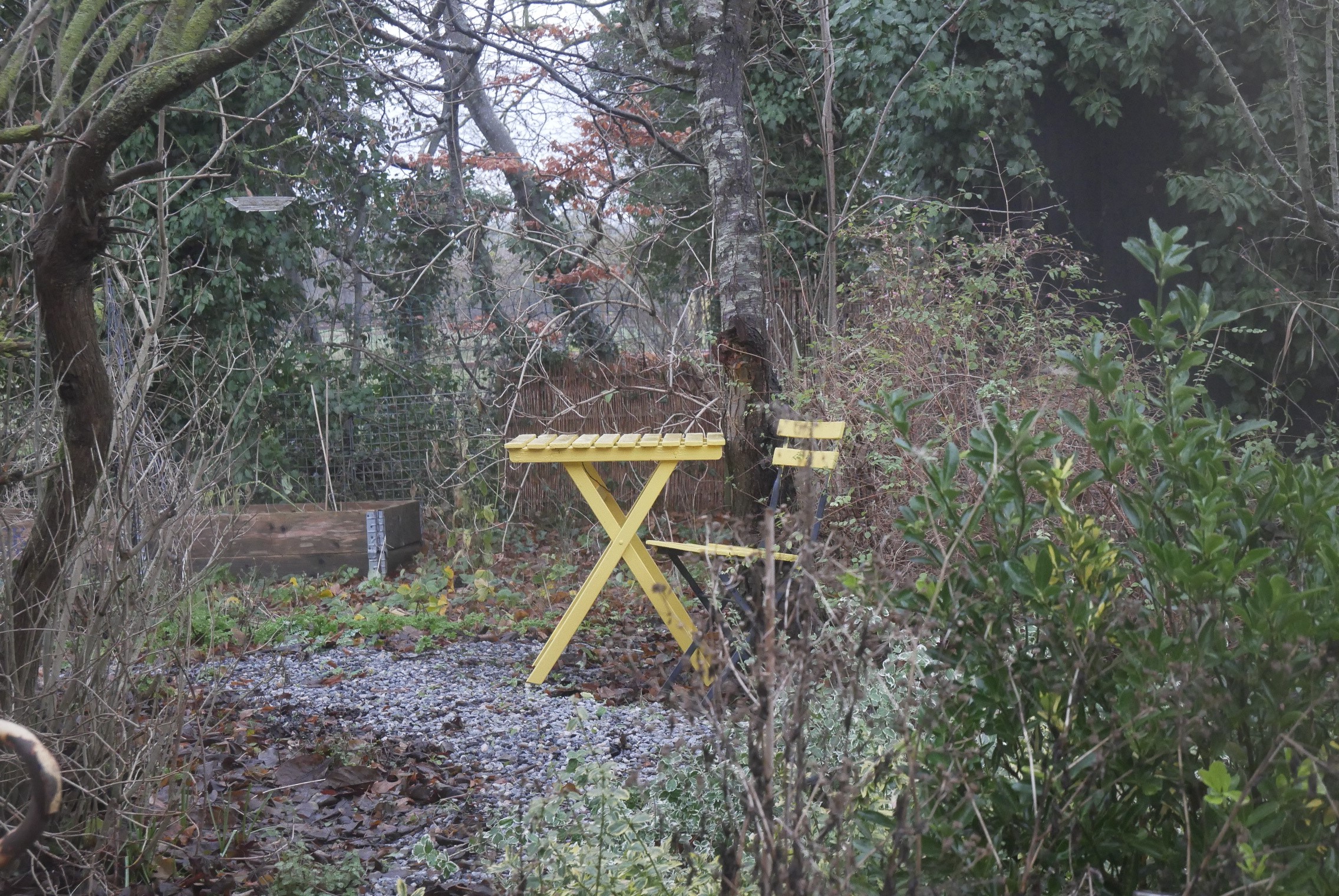黄色のガーデンチェアとテーブルもアートに見えてきます。