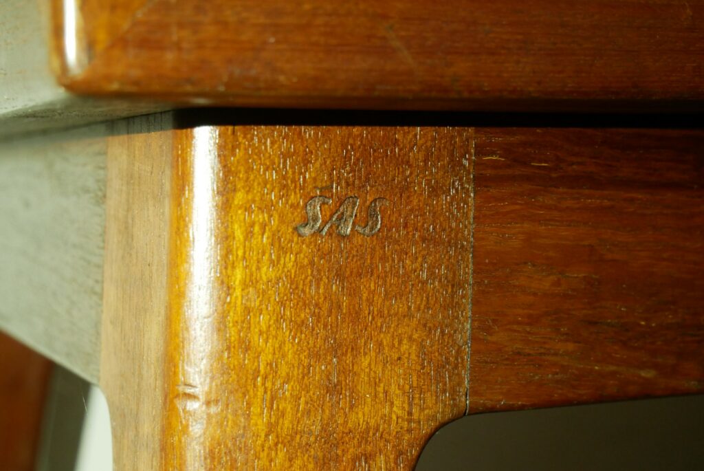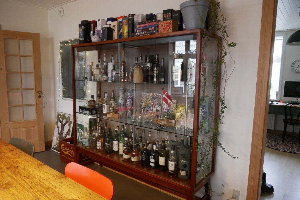 このお部屋の主役、J氏の趣味であるお酒のコレクションを収納している大型のガラスキャビネット。SASのプレートがあることから、アルネ・ヤコブセンがデザインしたことで有名なラディソンSASロイヤルホテル(Radisson Blu Royal Hotel)で使用されていたもののようでかなりレアな一品。生涯売らないとのこと。