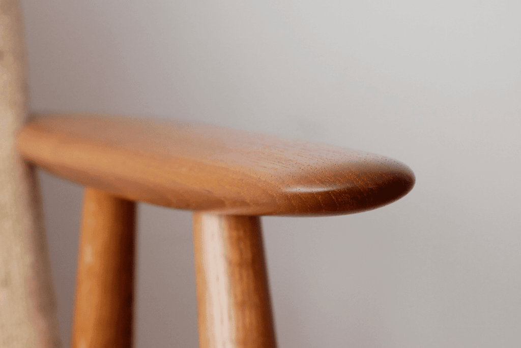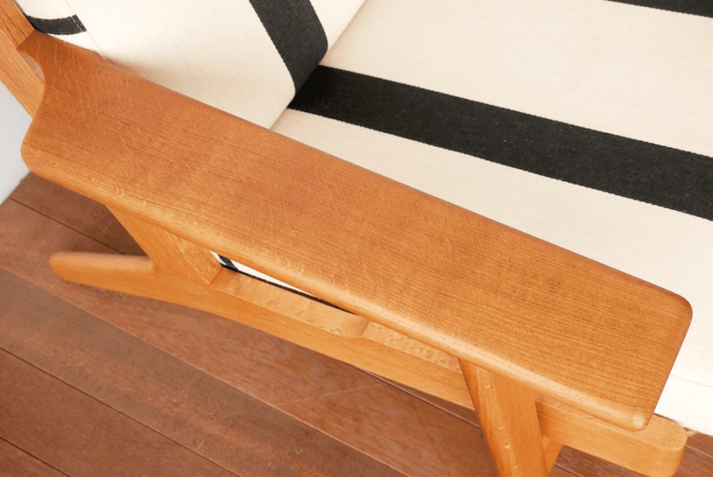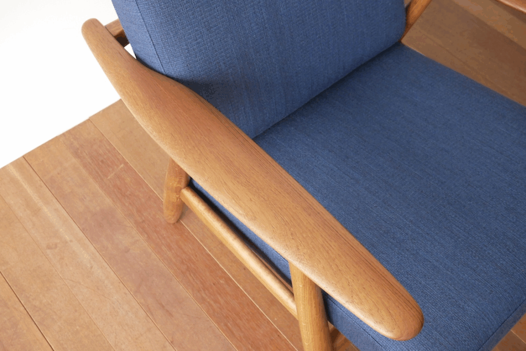 まずはなんと言ってもGE240の特長は、葉巻のような形状をしていることから通称シガーチェアと呼ばれているその丸みを帯びたデザイン。特に無垢材を削り出して作られたアームの滑らかな曲線は手にとてもよくなじみ、木の質感も楽しめます。アームがチーク材、他のフレームがオーク材の組み合わせのタイプは配色も美しく、それぞれの材の経年変化の色味も楽しめます。1955年にデザインされたとは思えないほど現代においても古さを感じさせない普遍的な美しさもまた魅力です。
