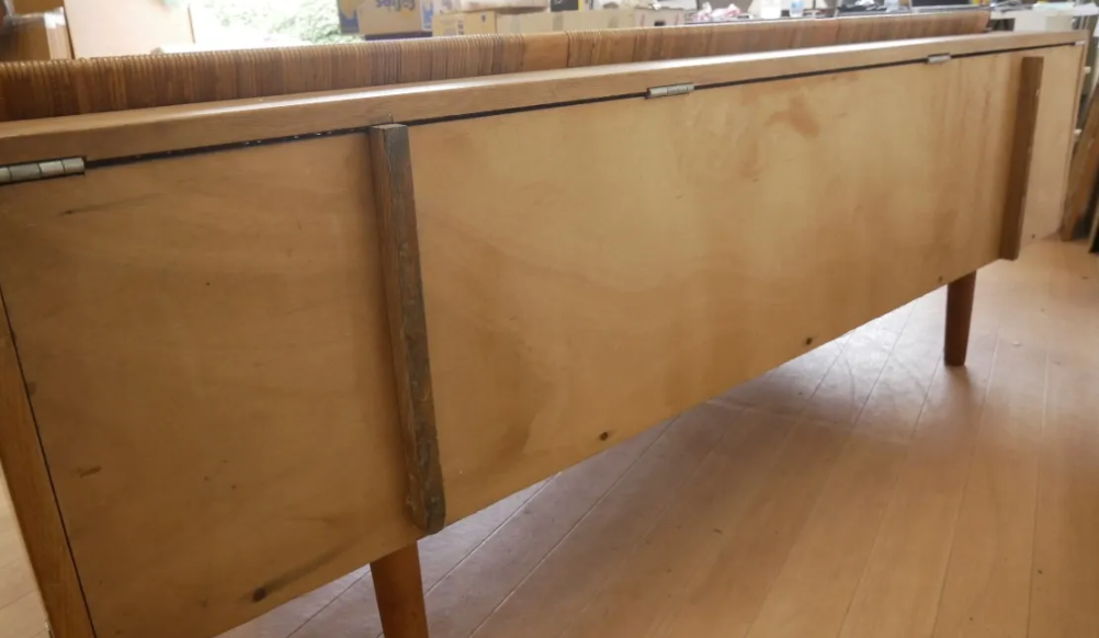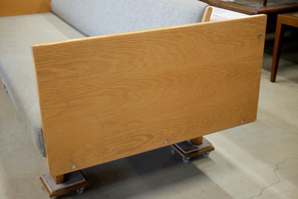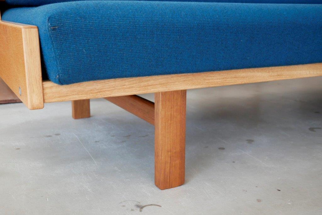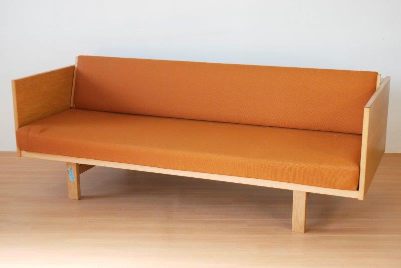 最初期タイプからひとつ世代が上がったタイプでGE-6と呼ばれています。脚は丸脚が基本で座面下の前板に丸みがあって柔らかい印象。現行タイプは背面が塗装されているものが基本ですが、こちらの旧タイプGE-6の背板はラワン材やシナ材を使用していており、空間の仕切りとしても使用できます。最初期タイプと現行タイプは座面クッションは取り外しができるのに対して、こちらのタイプはフレームに直接打ち込むため、座面の取り外しができません。現行タイプの幅206cmと比べると少し小さい幅195.5cmなので、小さ目のサイズでお探しの方におすすめ。