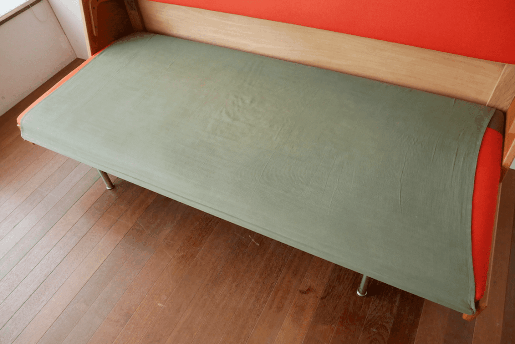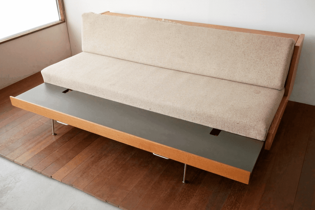 GE258はデザイン当時、学生寮向けにソファ兼ベッドとしてデザインされたこともあり、ベッドしても使用できることも大きな特徴。背もたれを上げると大人がゆったり横になれるスペースになり、お昼寝用や来客時の寝具としても活躍します。ベッドとして使用する際に使用できるシーツが付属するのがオリジナルの仕様。