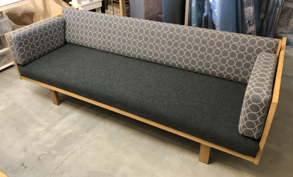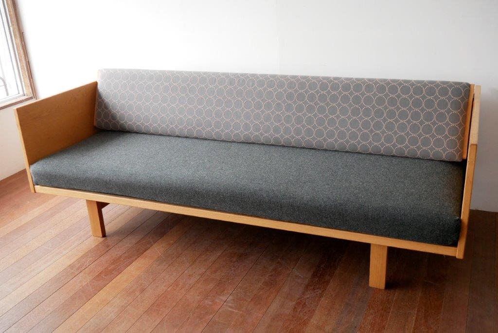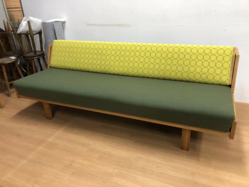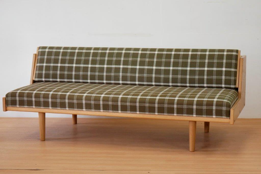 GE258デイベッドのひとつの楽しみが張替。座面と背もたれを同じファブリックで張り替えるのが基本ですが、あえて色違いにするのもおすすめ。これまで当店で張り替えた一部のデイベッドをご紹介しますのでぜひ参考になさってください。
