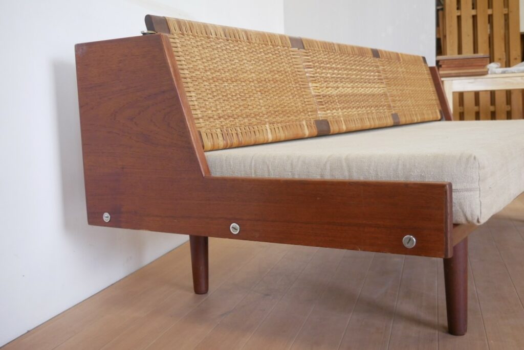 最もスタンダードなタイプのデイベッドGE258。袖ありタイプはGE259と呼ばれます。幅は206cmと最も大型でゆったりしています。脚は角脚が基本で直線的ですっきりとした印象のデザインです。座面のクッションは取り外しができるので、掃除の際にも便利。背面は青みが掛かったグレーで塗装されていることが多く他の仕様と異なるポイントです。背もたれはファブリックを基本として、ラタン仕様やチーク材のみの仕様なども存在しています。希少性の違いから上記の2タイプと比べて価格は抑えられる傾向です。