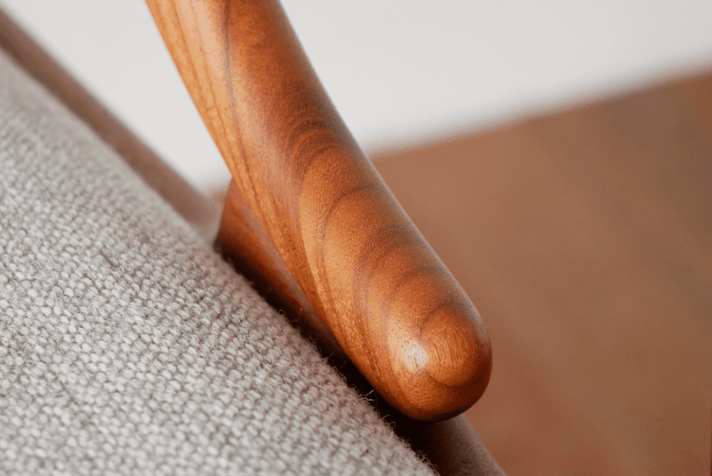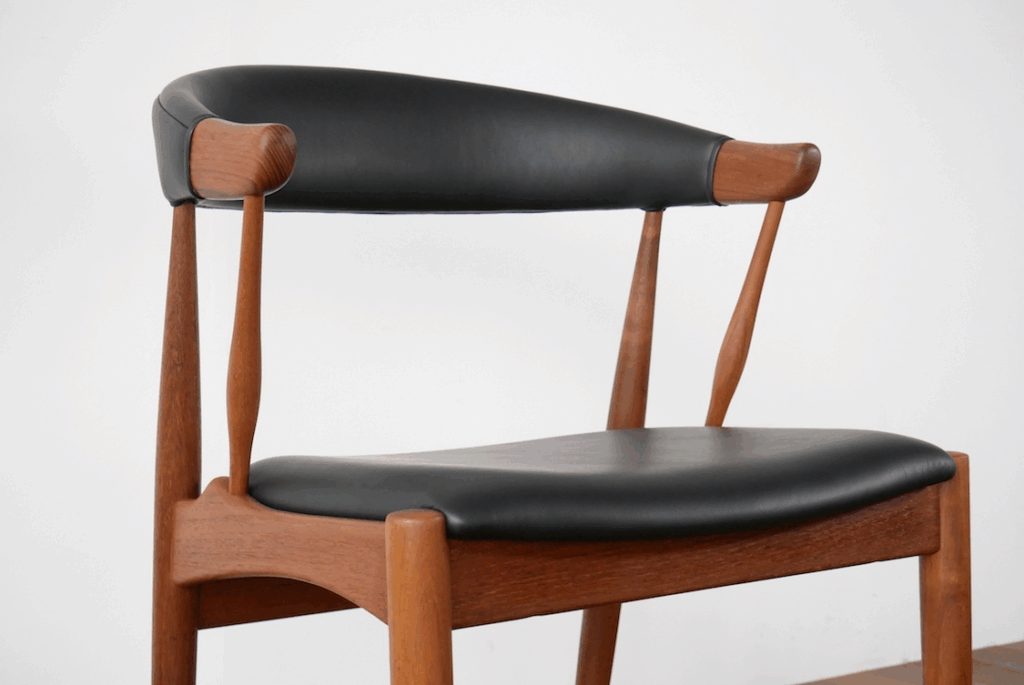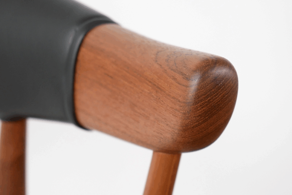 特にこちらのモデルのぐぐっとくるポイントは上記画像の座枠にそっとやさしく触れているかのようなアーム先端のデザインで、手間をかけて丸く削り出して作られた造形にデザインのこだわりを感じます。加えて、背もたれも丸みを帯びており、アームから背もたれに掛けてのラインが非常に美しくデザインされています。北欧ヴィンテージの中でもさまざまなチェアが存在していますが、その曲線の美しさで右に出るものはなかなかないのではないでしょうか。