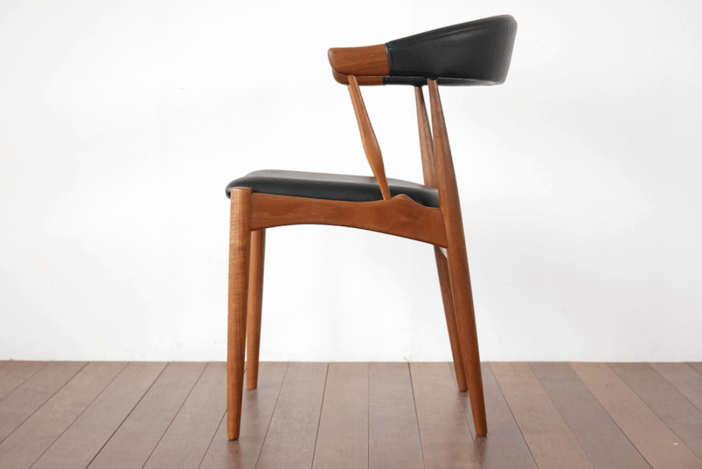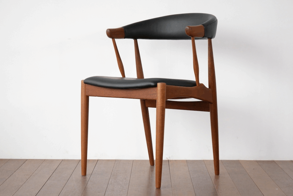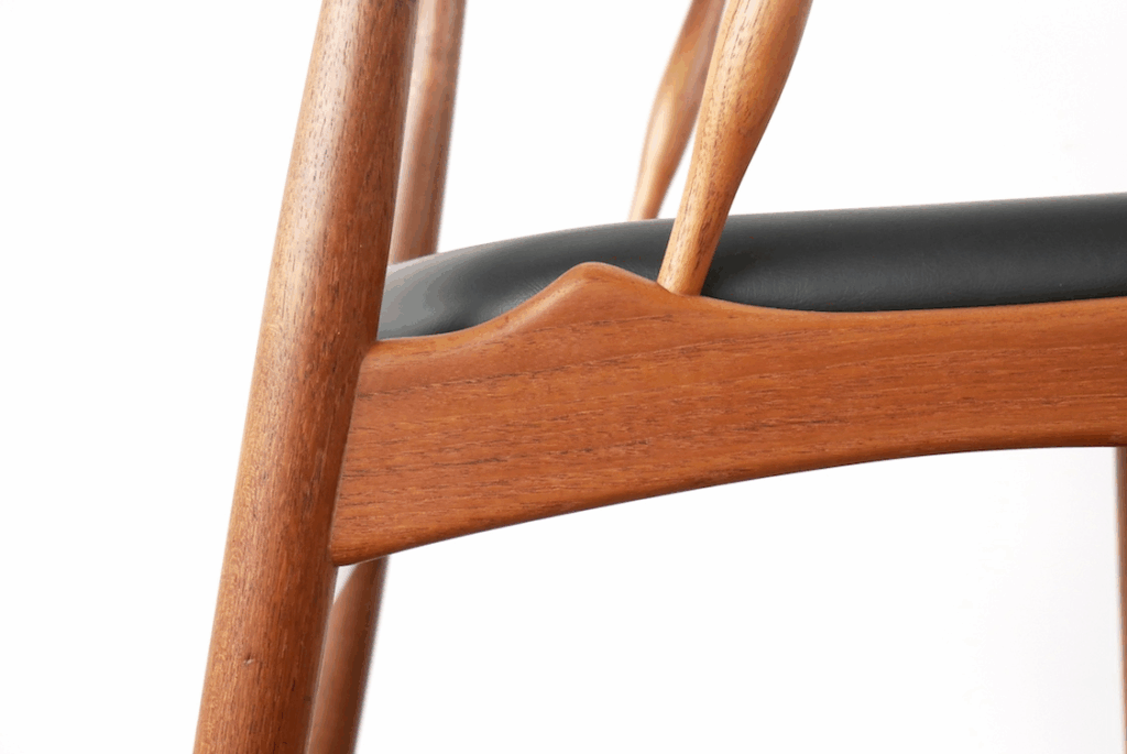 ヨハネス・アンダーセンのチェアの代表格のこちらのチェア。北欧ヴィンテージ家具業界でも定番のモデルですが、背もたれから座面に伸びるアームの滑らかさは、木を削り出して作られているように見えないまるでガラス細工のような滑らかさ。この細く丸みを帯びたアームは、座った状態で少し椅子を前に出したいときに手で持つとしっくりくる位置・角度になっており、しかもとても手に馴染む造形で、ついつい触りたくなってしまうほど。