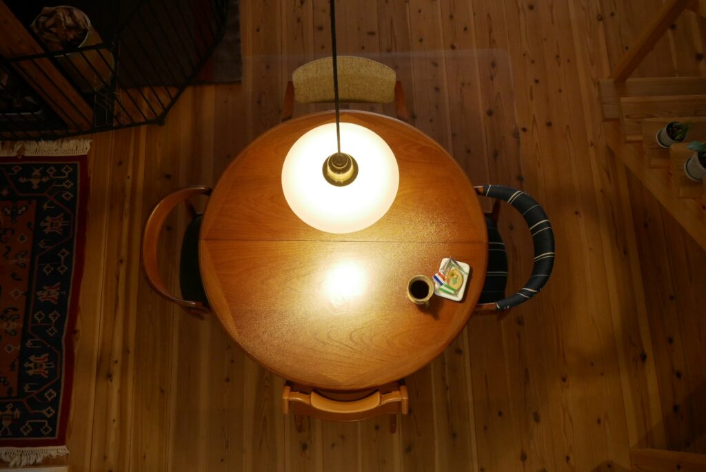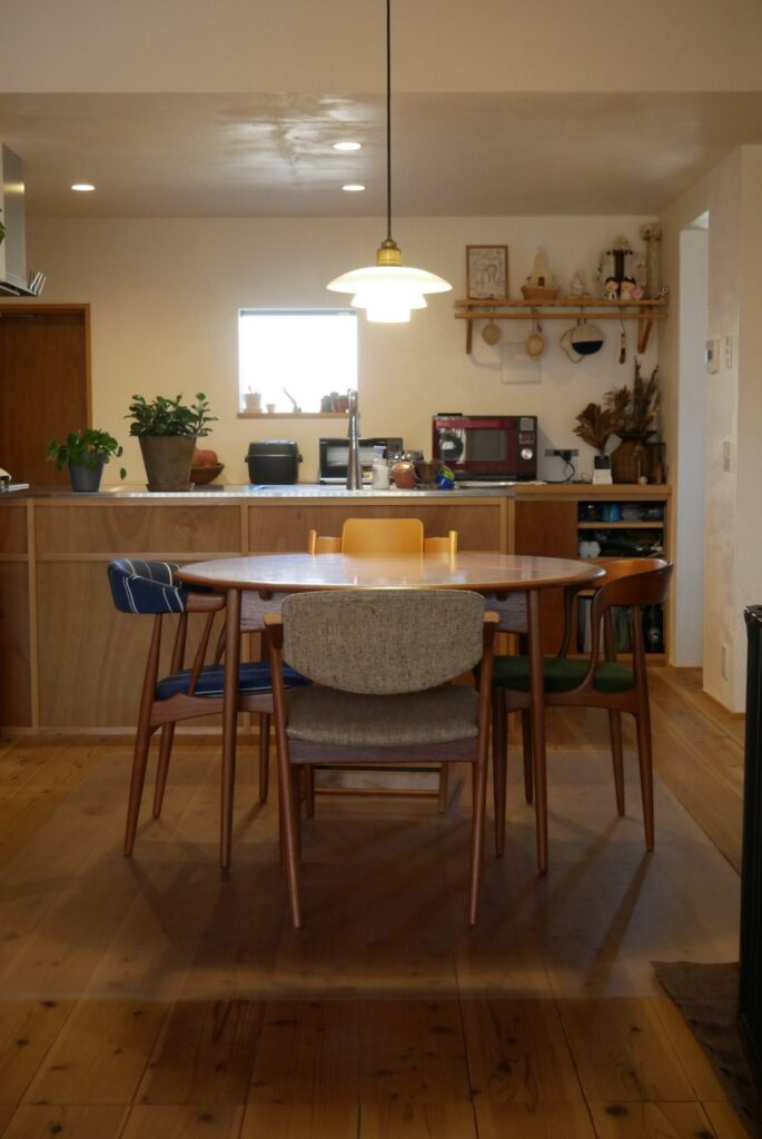 Iさん(旦那様):まさにこのダイニングテーブルがそうですよね。エクステンション天板内蔵の丸テーブルはいろいろ調べてみていいなと思っていて、その機能がありながらこの丸みを帯びたデザインのテーブルをtanukiさんでみたときなんだこれは!と思いました笑。その時見たテーブルは売約済みでしたが、同じテーブルの買付依頼をさせていただき、数年越しで見つけていただきました。