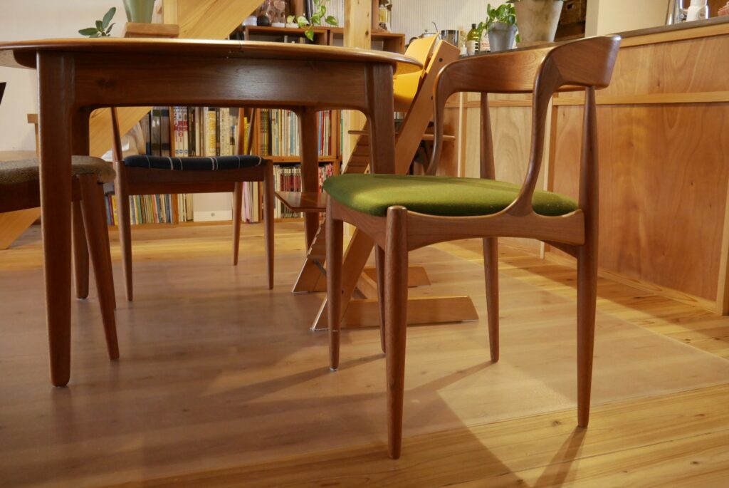 Iさん(旦那様):エクステンション天板内蔵タイプはイギリスのものだとまだ数はあるけどデンマークのものだと全然見つからないですし。そういうのも面白いなと思いました。テーブルに合わせてあるこのヨハネス・アンダーセンの椅子もディテールや曲線がきれいで気に入っています。