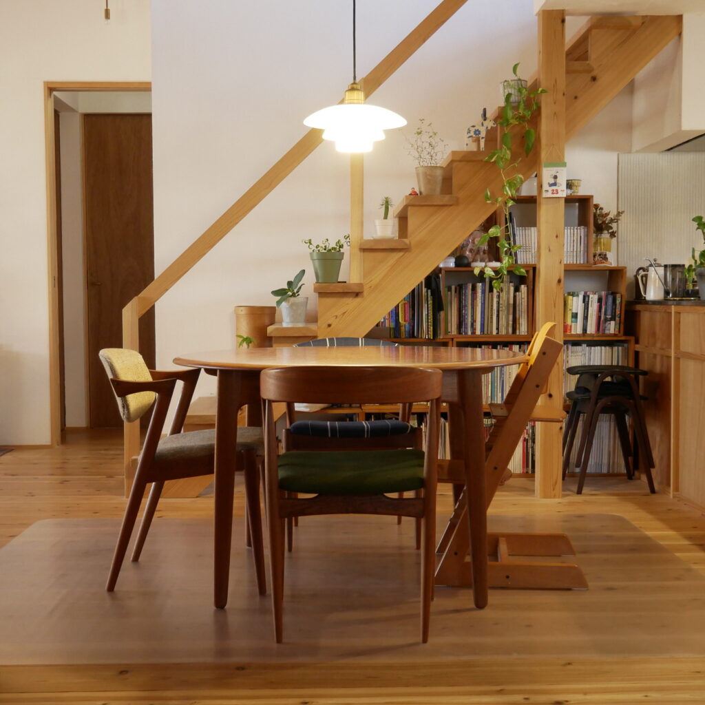Iさん(旦那様):最初はテーブルや床にシートはしていなかったのですが、フォークで天板を引っかいたりしたことがあって一応シートを敷くようにしました。そのほかにも椅子を噛んだりしたこともありましたが笑、そんなに気にしていないというか、もうしょうがないよねという感じです。なにかあればオイルを塗ったり自分たちでメンテナンスすればいいし、どうしようもなくなったらtanukiさんにお願いすればいいかなと思っています。