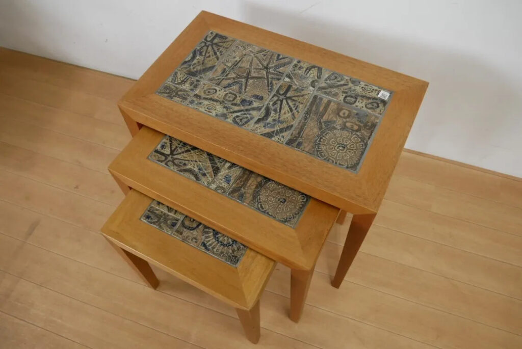 北欧ヴィンテージ家具の定番の人気商品であるロイヤルコペンハーゲン社とハスレヴ社のタイルトップテーブルは、実用性と美しさを兼ね備えた一品です。ハンドペイントされたタイルは、BACAやTENERAシリーズを中心に多様なデザインがあり、唯一無二の温かみが魅力。タイル天板は水や熱に強く、日常生活での使い勝手も抜群です。ただし、タイルの構造上、テーブルは重く、取り扱いには注意が必要です。また、落下や強い衝撃でタイルが割れる可能性もあるため注意が必要です。ヴィンテージならではの価値を感じつつ、実用的に使える点が多くの支持を集める理由です。お部屋に絵画を飾るようにぜひご自宅に取り入れてみてはいかがでしょうか。