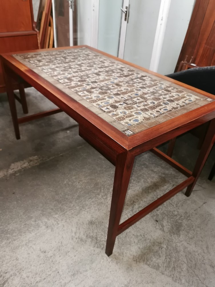 当店でも買付の度に現地で見つければ買い付けるハスレヴ社のコーヒーテーブル。いろいろなバリエーションが存在しますが、定番はこちらのデザイン。至極シンプルで直線を基調としたデザインにタイルが張られたものが基本です。脚は先窄みとなっており、野暮ったい感じがなく洗練された印象。脚を天板を繋ぐ留めは接着剤で固定されているため、金具などが裏面にもないすっきりとしたデザインで作られています。天板は上記画像のように全面にタイルが張られたものから一部のみというものも存在します。