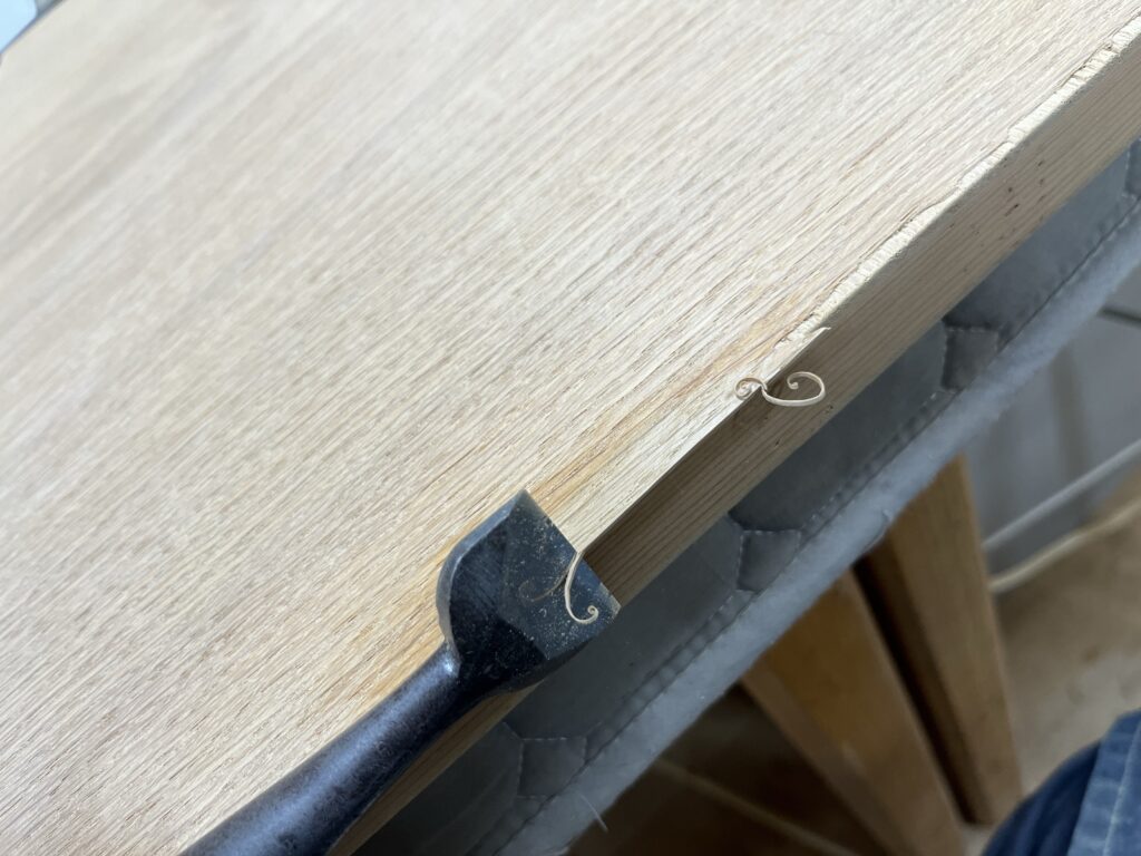 鑿(ノミ)で剥がれた突板の部分を整えます。この時、範囲が最小で目立たなくなるように気をつけます。
