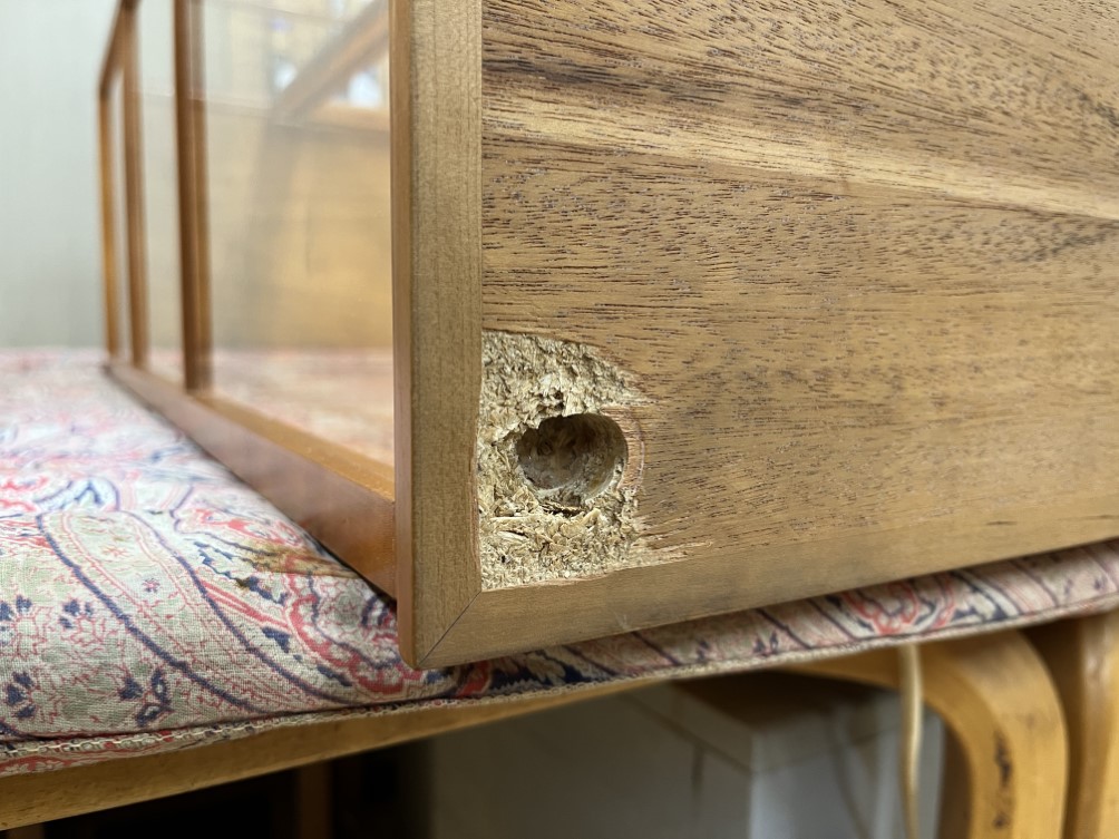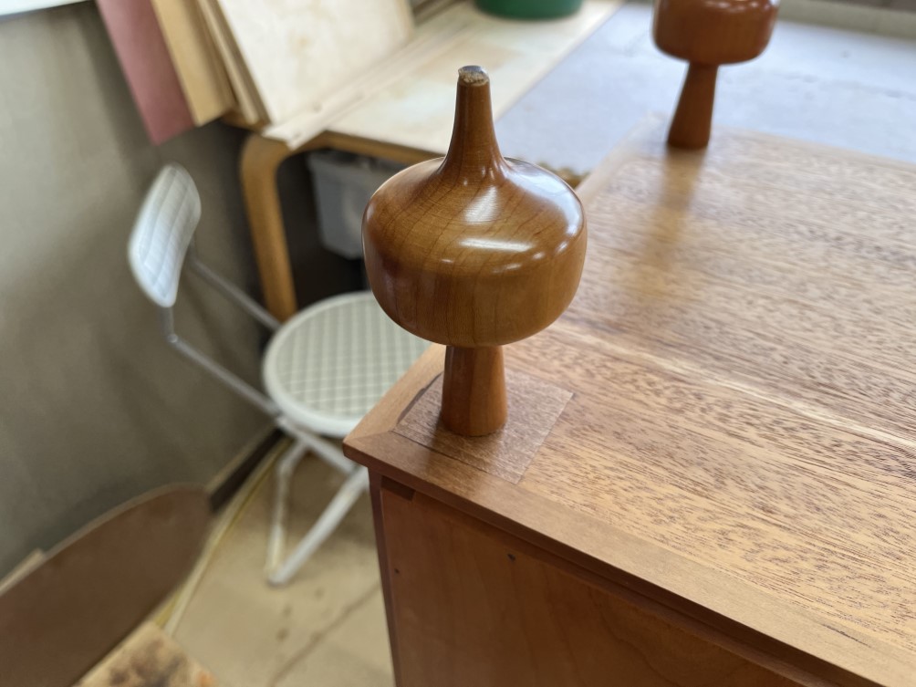 今回はカール・マルムステンのキャビネットの脚のメンテナンスでした。このタージマハルの屋根みたいなコマみたいな形のものが脚です。はじめ見たときはデザイン性とユニークな形にびっくりしました。次回のメンテンスブログも楽しみにしていただけますと嬉しいです。