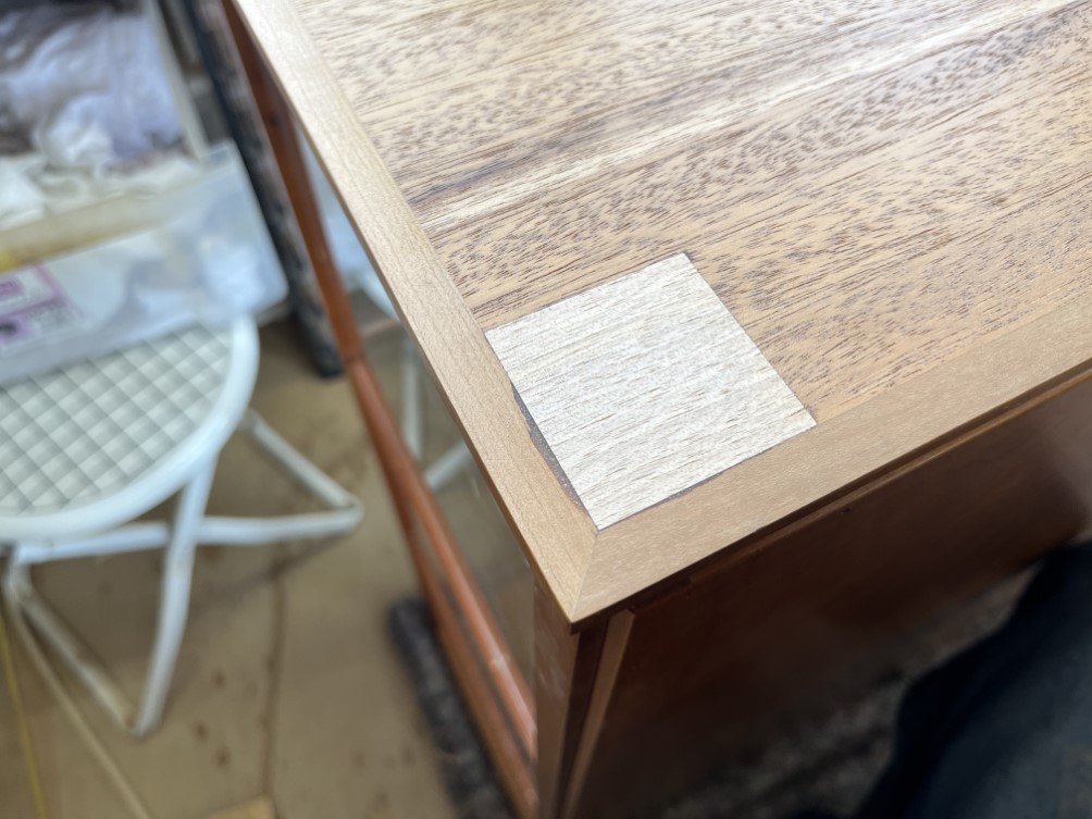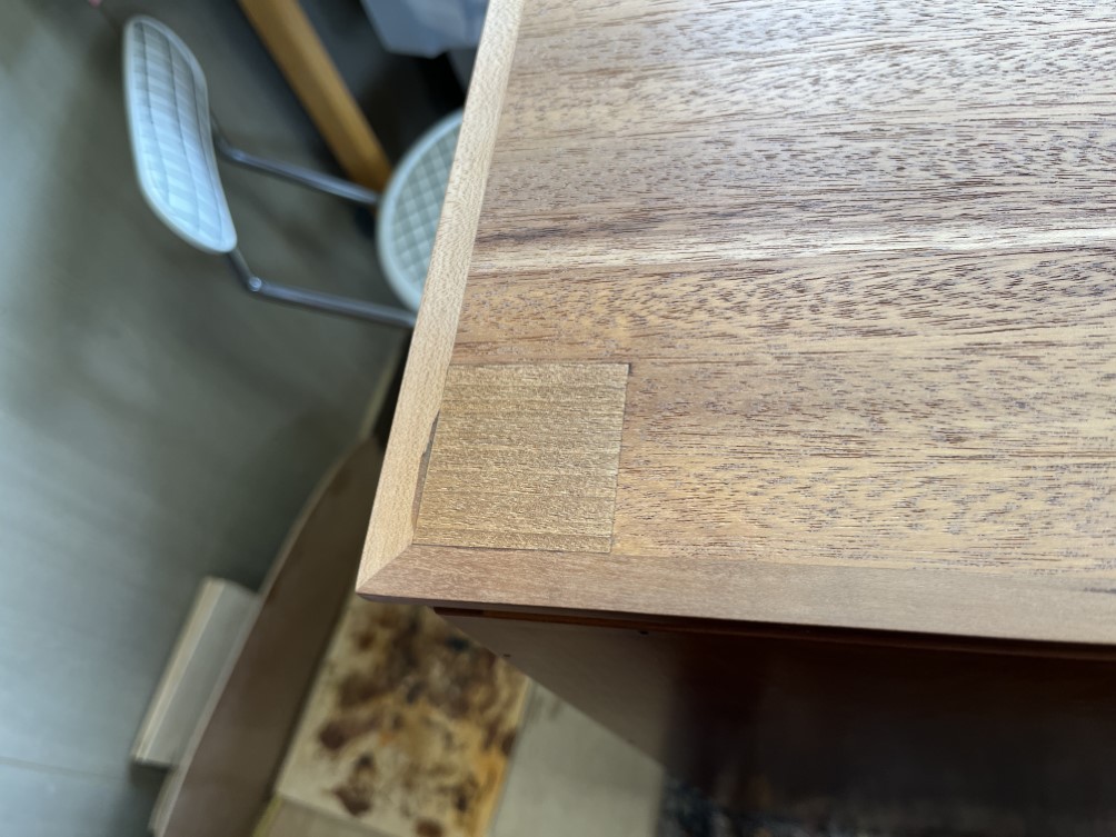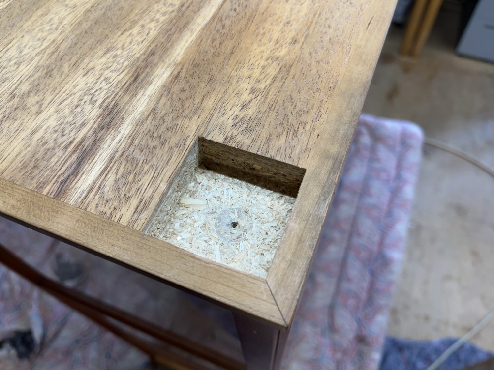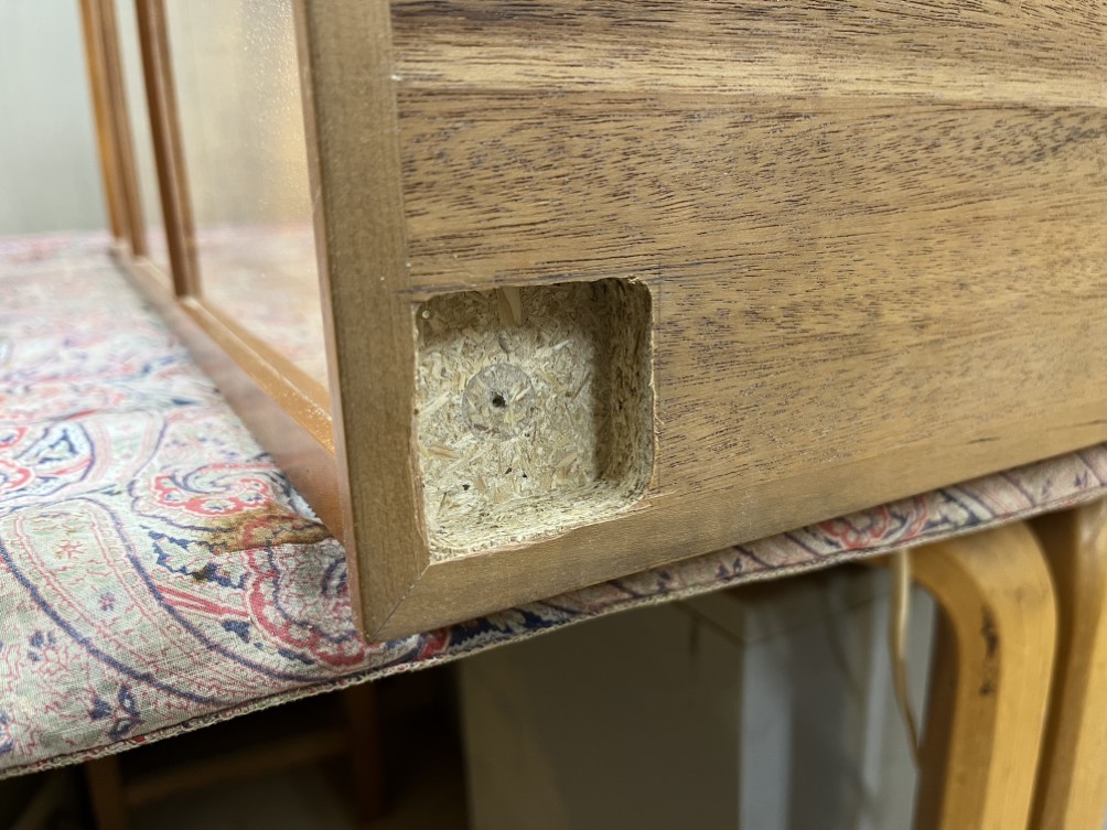 脚に変な力がかかったのか脚が外れパーチクルボードがぼそぼそになっています。そのまま接着すると強度に不安があるため少し大きめに削り修理していきます。