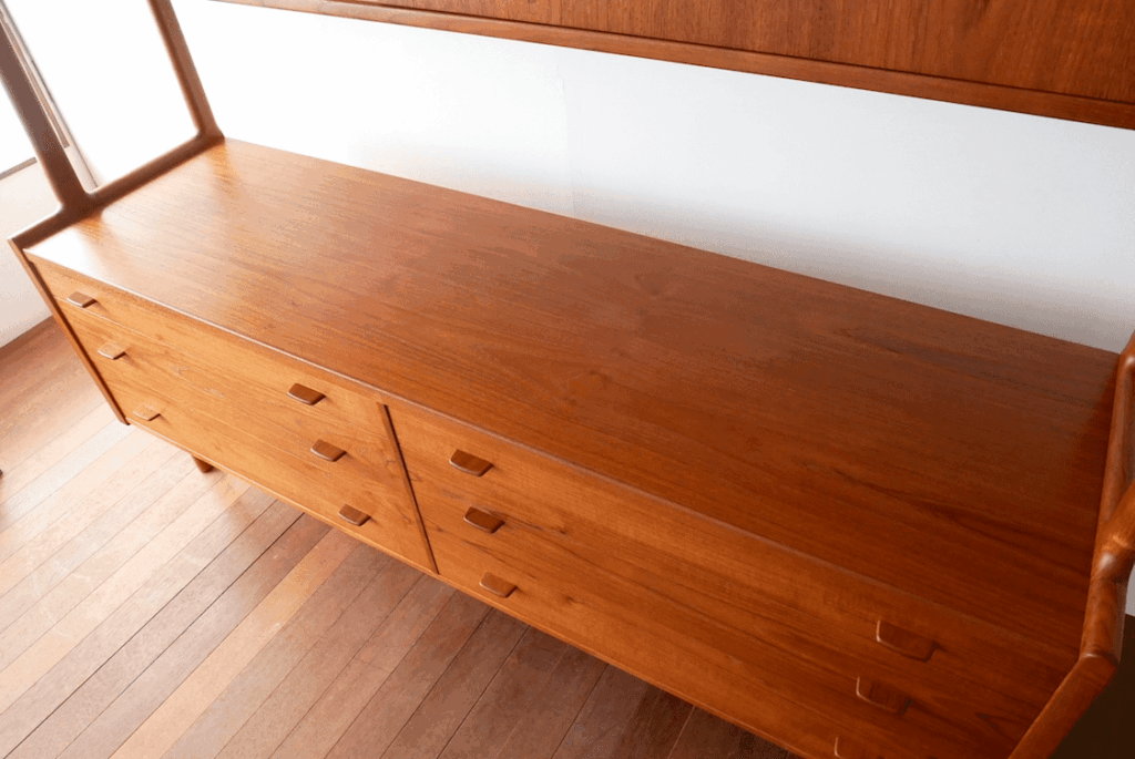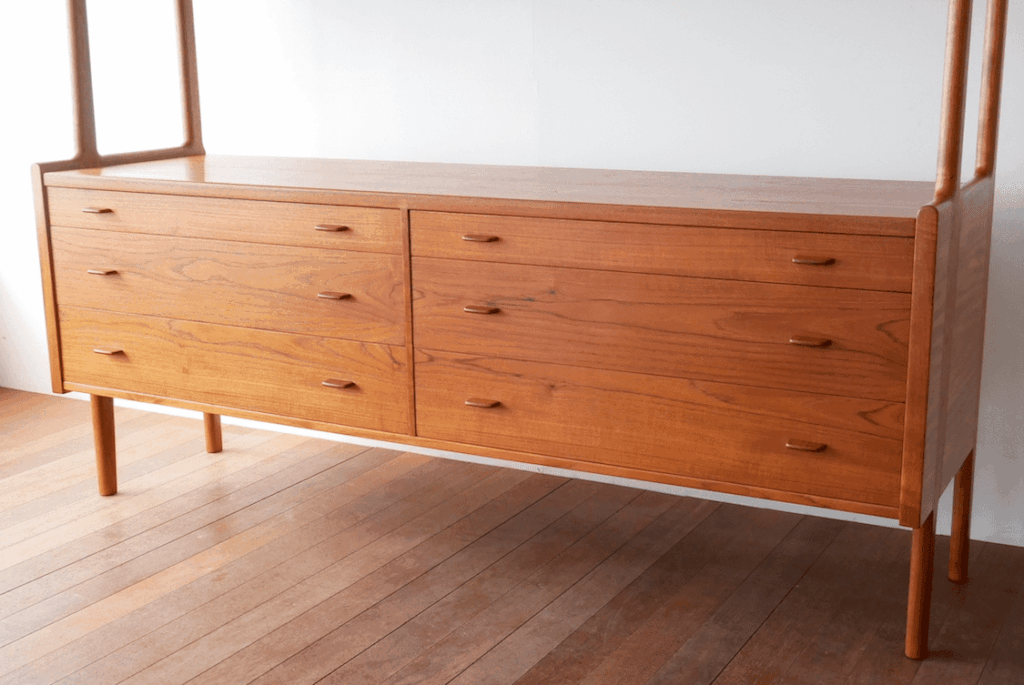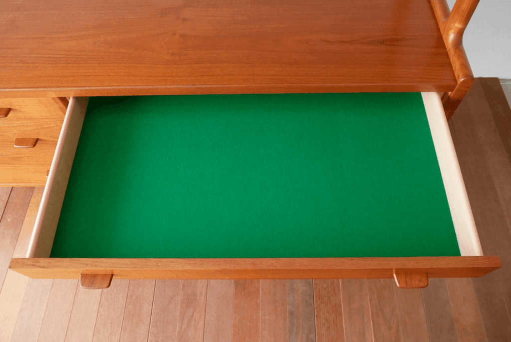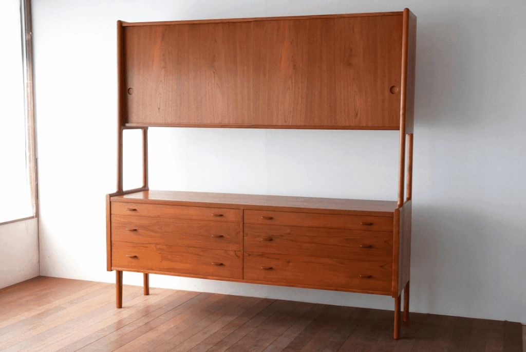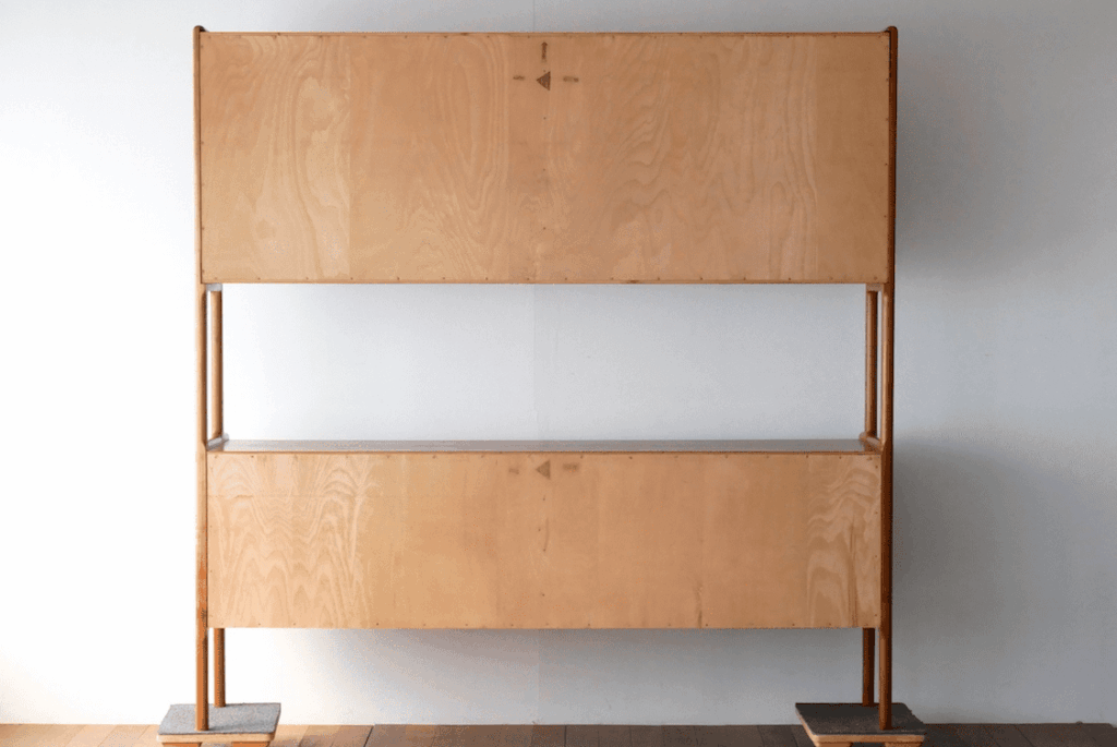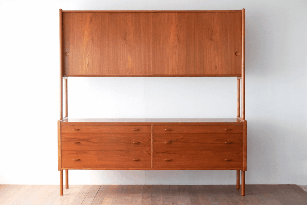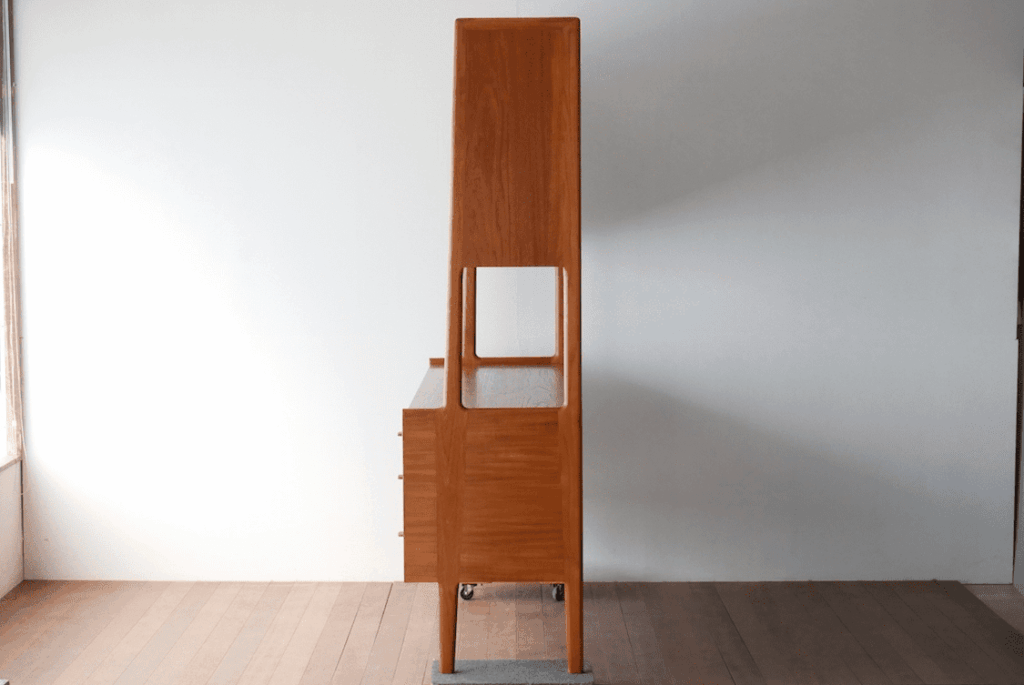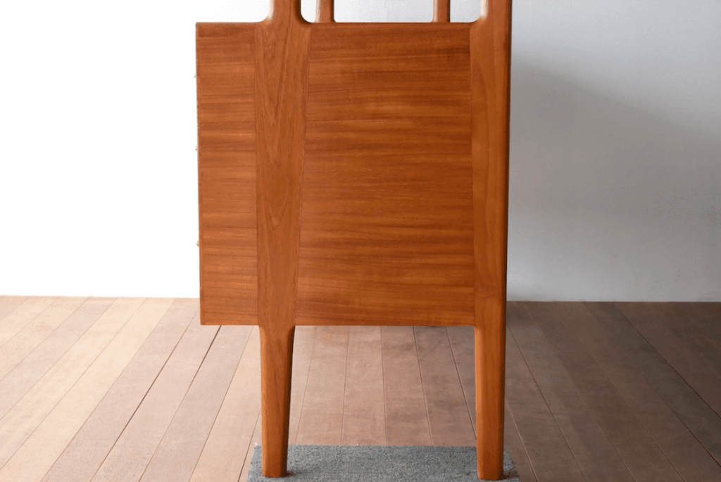 美しいデザインに加え、もちろん収納力といった実用性も申し分ありません。下段は引き出し6杯、上段は食器や小物類の収納に重宝する引き戸仕様となっており、下段の天板をはじめ上段の扉を開けっ放しにすれば、収納しながらディスプレイも楽しめる、そんなデザインになっています。ちなみに設計当時の構想がなにかあったのか、上段の右側の引き出しのみ底板にフェルトを敷いている仕様が良く見られます。当時はカトラリーを収納する前提でこのような仕様になっていたと思われます。