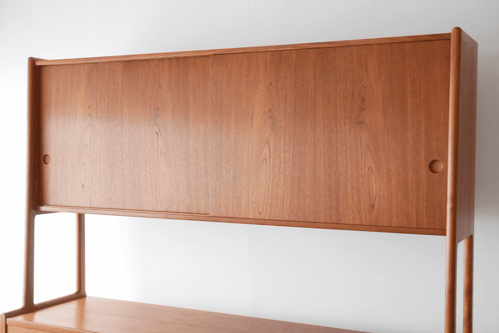 ハンス・J・ウェグナーのRY20は実はいろいろなヴァリエーションがあります。材はチーク材かオーク材、上段の扉は木材のタイプか籐タイプ、下段の把手は平たいものか丸いものなどが存在しています。通常よく見つかるタイプはチーク材、平たい把手、上段木材仕様です。