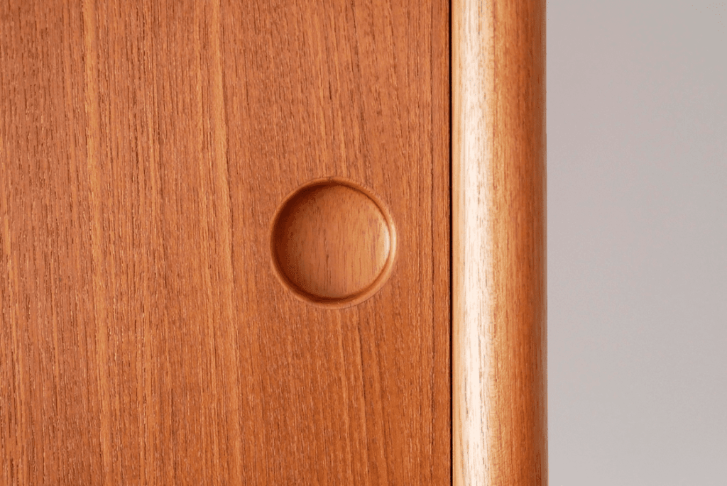 RY20は幅180cm高さ180cmという大型サイズながら、驚くほど空間に馴染みます。その理由は、上段の奥行きが浅く設計されていることと、全体のフォルムが極めてミニマルであること。加えて、上下段の間が抜けていることと、上下段を支える左右の側板にも空間を持たせることによってさらに軽やかな印象に仕上がっています。この部分が板だったら、印象もかなり異なるはずです。また、上段の把手は丸く掻き込まれ、下段は最小限のつまみ程度のデザインもミニマルでどんな空間にも馴染むデザインに仕上がっています。無駄を削ぎ落としたラインと、チーク材やオーク材の温もりが調和し、視覚的な軽やかさを生み出しています。大型ながらこれぞ北欧家具らしい「静かな存在感」が、インテリアに品格を添えて、多くの方が憧れる存在になっています。