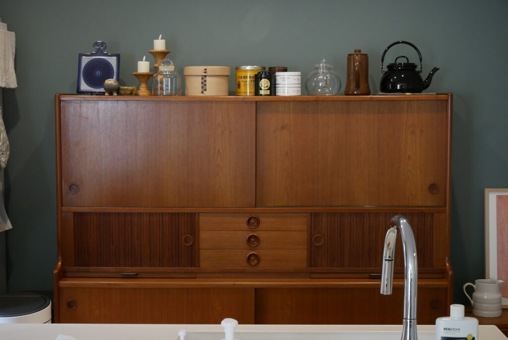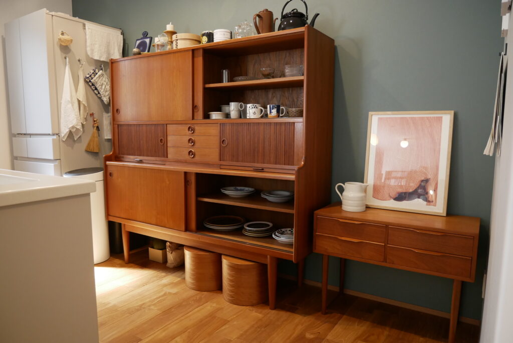 奥様:キッチン裏のクロスの色は北欧ヴィンテージが栄えるような色味にしました。ヨハネス・アンダーセンのサイドボードは食器棚として使用していますが、このサイドボードを使いたかったのでキッチンには吊戸棚などは作りませんでした。