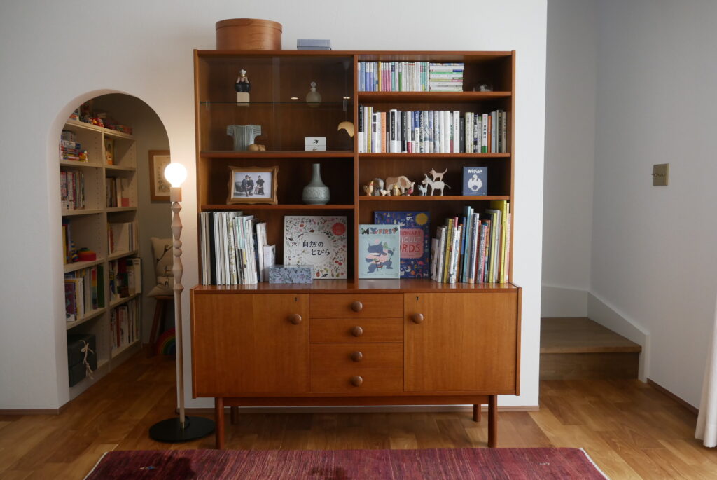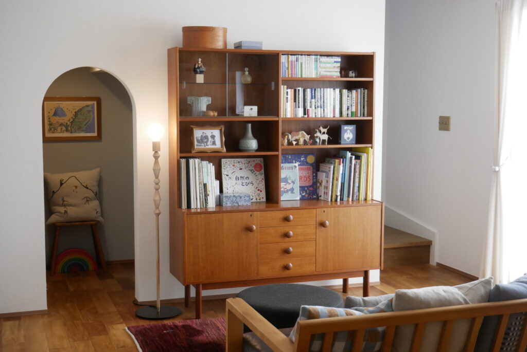 奥様:北欧ヴィンテージ家具は空間にマッチしていますし、温かみを感じながら暮らせるのですごく幸せです。tanukiさんで購入したメインのブックシェルフも、全体的に直線的なデザインですが、脚が楕円だったり把手は丸くなっているので、空間も柔らかくなります。ひとつ置くだけでも空間が素敵になるので、そういったものに囲まれる幸せ、喜びはありますね。