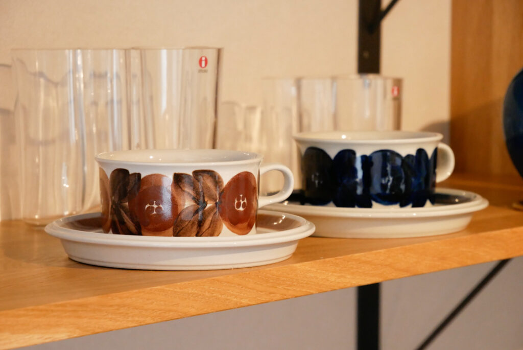 西谷さん:私は、学生の時に一人旅でフィンランドとデンマーク、スウェーデンに行ってから北欧好きが始まりました。その時はグスタフスベリやアラビアの工場に行ったりして器が”すごい好き”だなと感じて、北欧雑貨はそこからスタートしました。その後、デンマークの椅子の博物館に行ったところでさらに目覚めました笑。最初に購入したヴィンテージ雑貨はネットで購入したアラビアのカップ、家具としてはtanukiさんで購入したTチェアと照明でした。