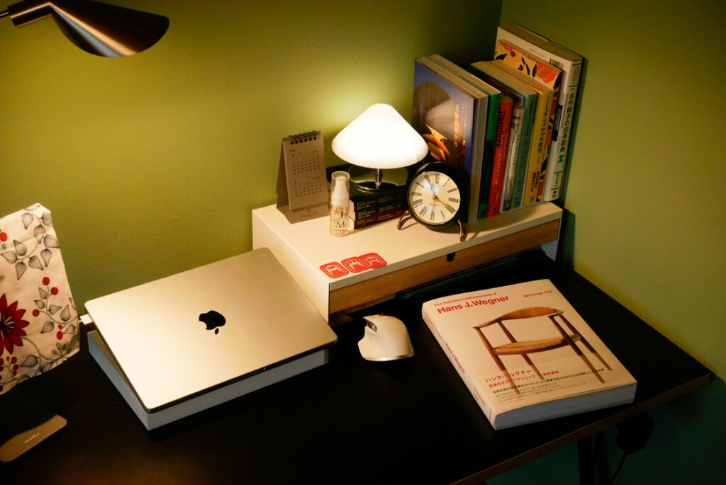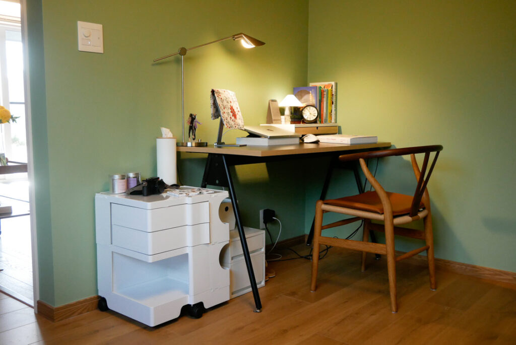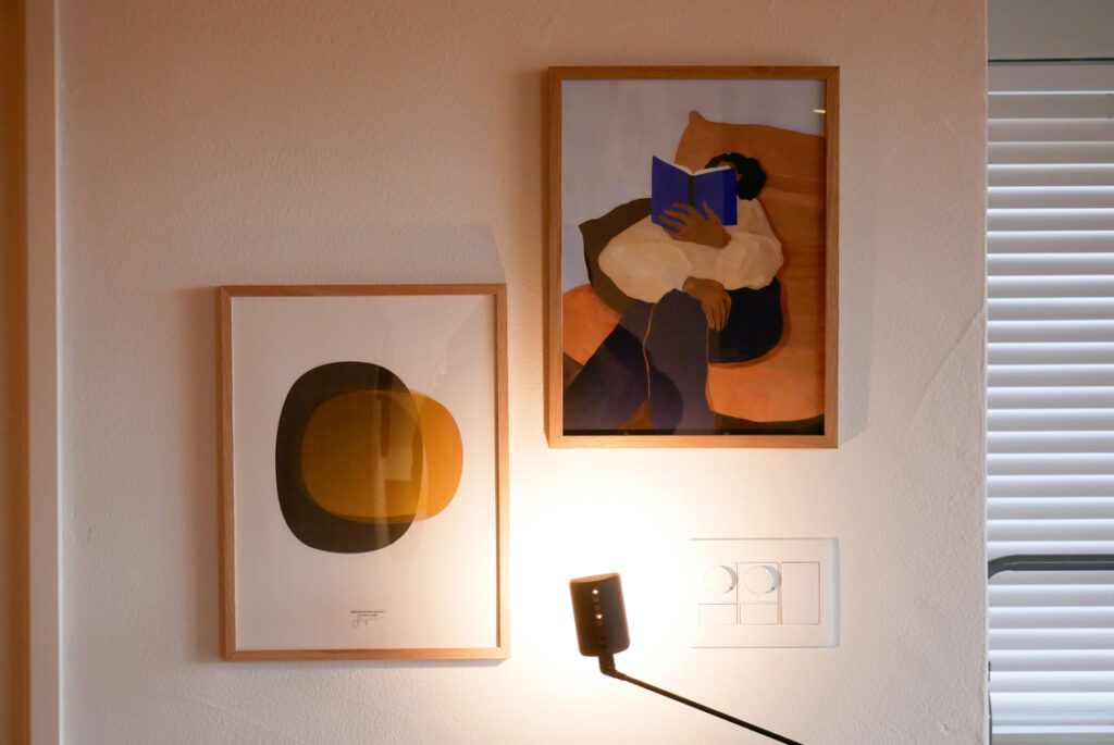 西谷さん:実は、ポスターは前々からそこに飾ってあって以前からちょっと位置が高いなって思っていました。どうしてもスイッチと高さ合わせたくて。PK0を合わせていた時期もありましたが、空間が開いている気がして気になっていました。そこに購入させていただいたワゴンを置いて、ライトも置いたら立体感が出てちょうど良くなりました。