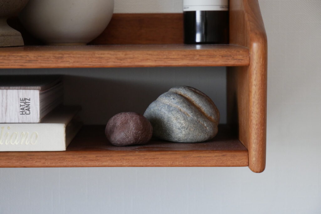 成田さん:すごくいいと思います。大切に使いたいと思いますし、なんというかディテールが上品なんですよね。例えばカイ・クリスチャンセンのウォールシェルフのこの前面に微妙な角度が付いていたり、曲線の美しさだったり、仕上げ方だったり、こういったところが美しいですよね。普通は直線的に簡単に仕上げてもいいところもデザインにこだわっているから、すごい上品というか上質というか、そういうところは感じます。大げさでも目立つわけでもないのだけれど、これがあることによって雰囲気が全く異なるものになってくる。そのあたりのレベルが高いと思います。