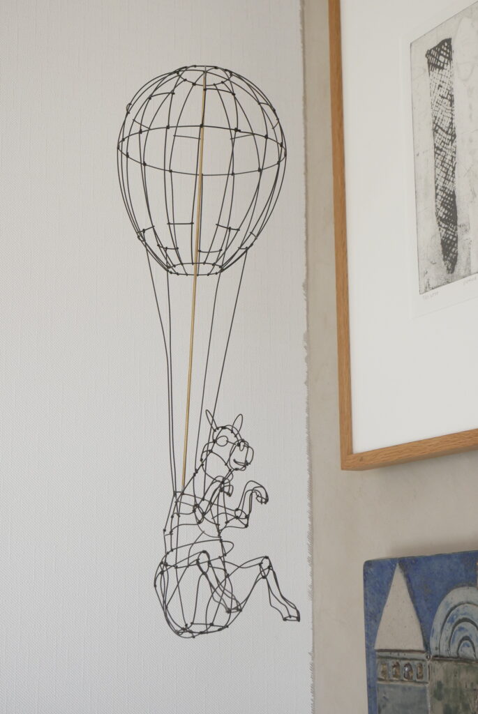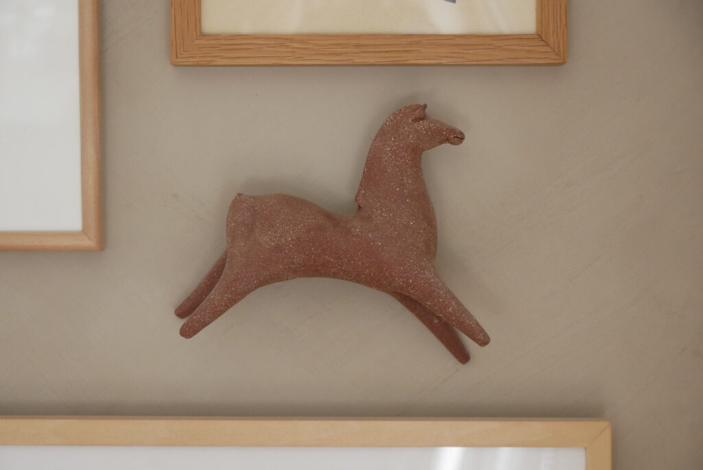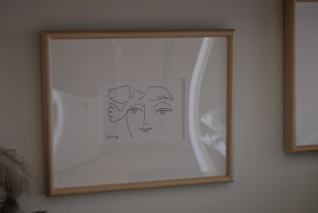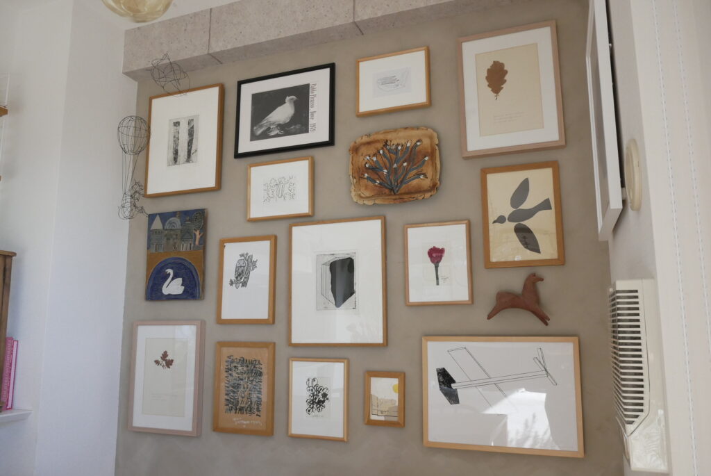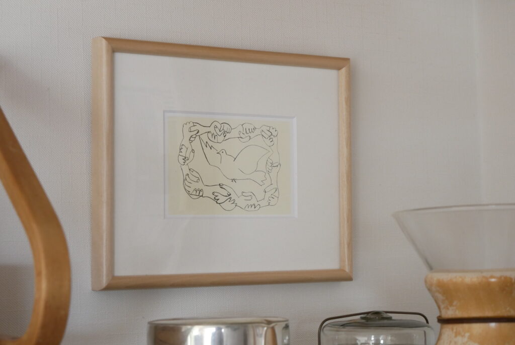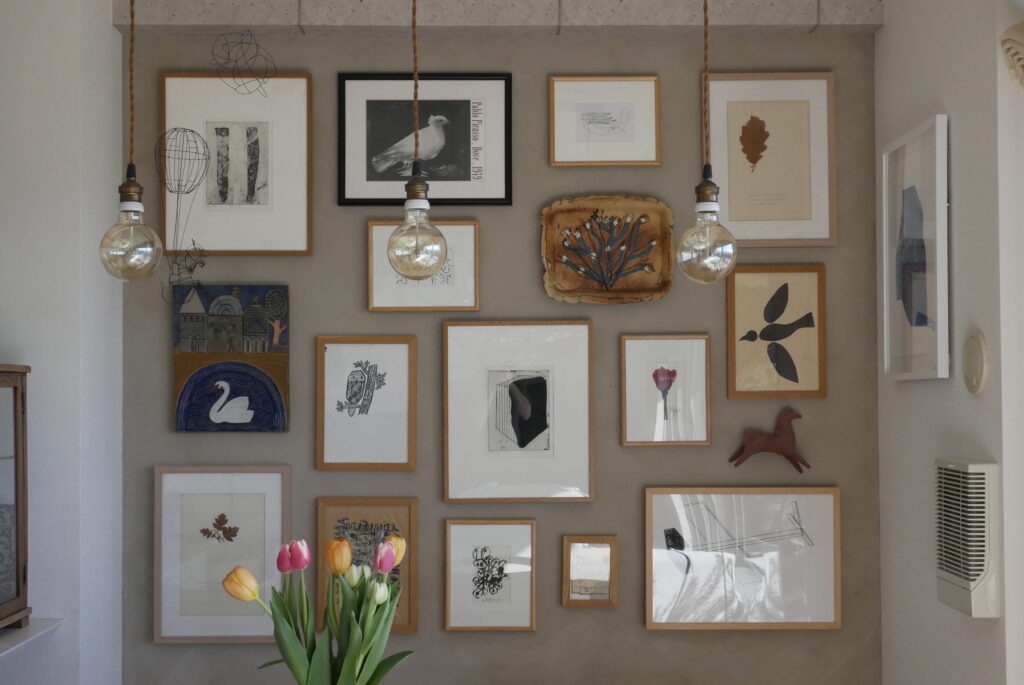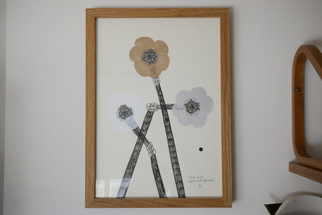 成田さん:現代の作家とかアート、ヴィンテージとか北欧など本当にいろいろミックスしていて、値段ももちろん高いものありますが、すごい安いものもいっぱいあります。例えばドイツの教材らしいのですが、パリの蚤の市で数百円で買ったものを額装してみたり、作家さんとやりとりしているときに封筒にちょっとした絵をかいてくれた時のものを飾ってみたりしていて、本当に自分がいいと思ったものを高い安い関係なく飾っている感じです。
