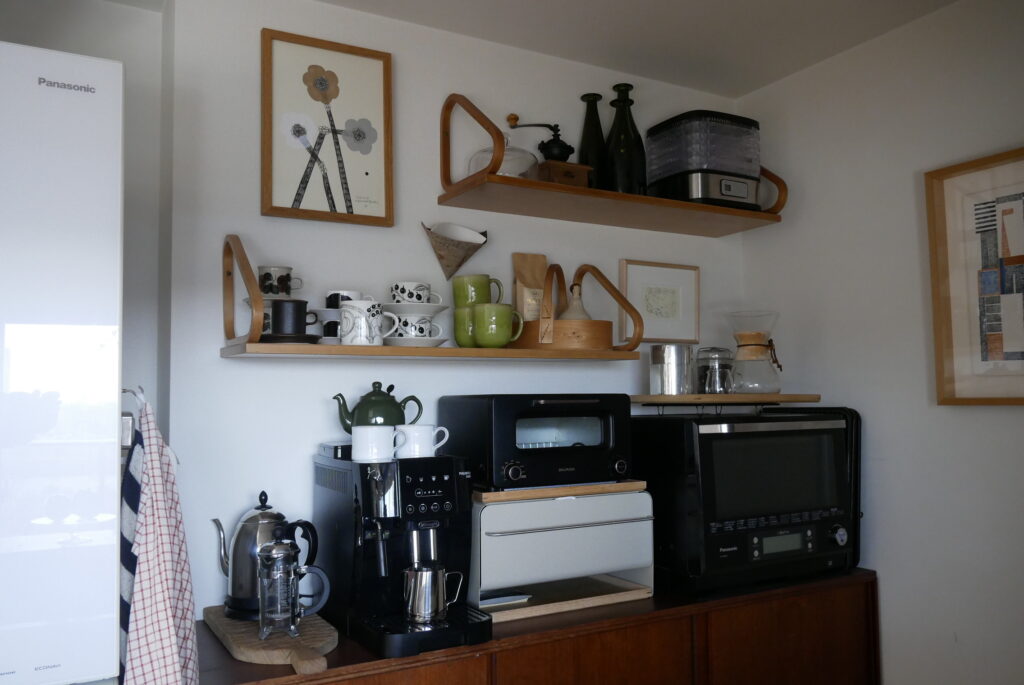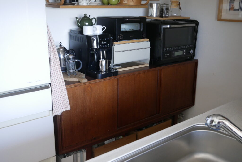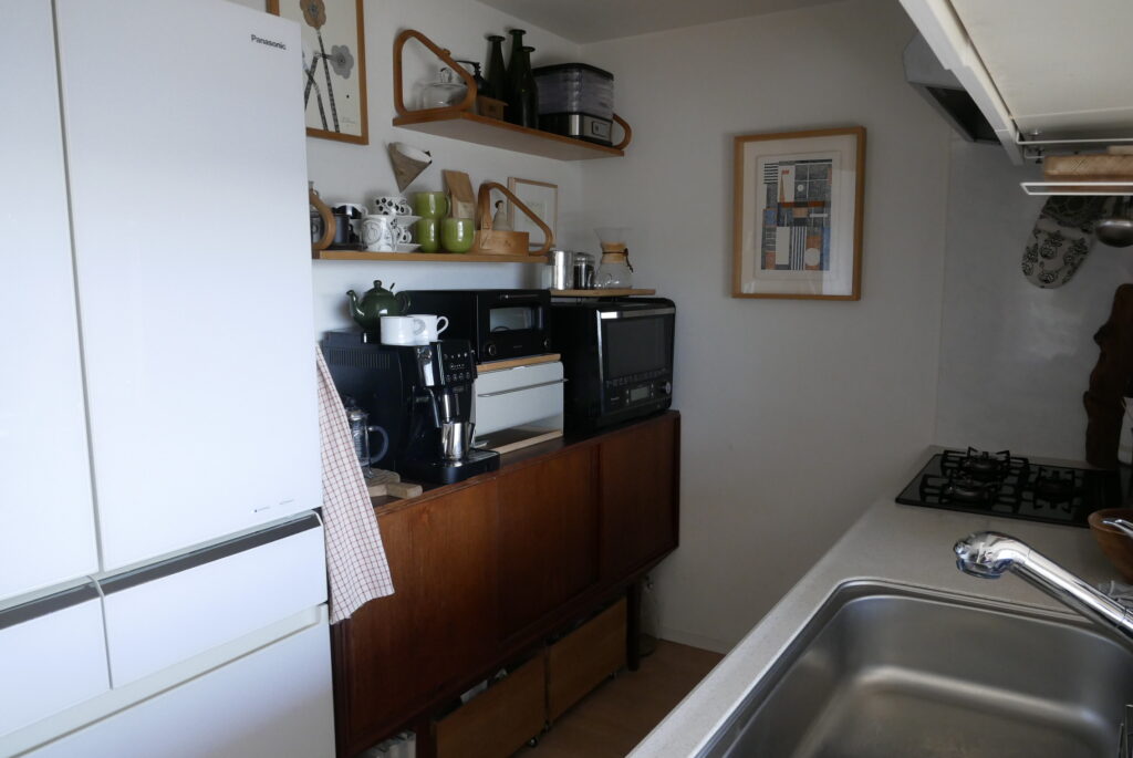 成田さん:お気に入りというか、なかなか見つけられないと思うものだと、tanukiさんで購入したこのサイドボードは当時相当探していました。冷蔵庫と壁までの間に入って、天板にコーヒーメーカーなどを置きたいので高さも重要、奥行きも限られるということでサイズが一番のポイントでした。まさにドンピシャなサイドボードで、なかなか見つからないと思うので、本当に見つかってよかったと思っています。