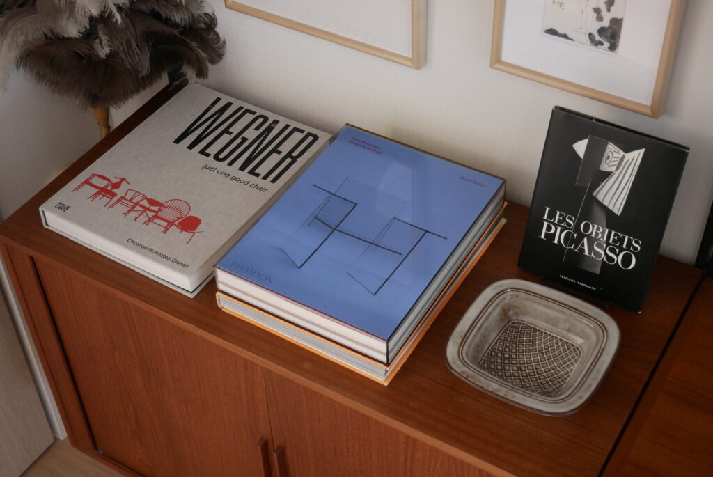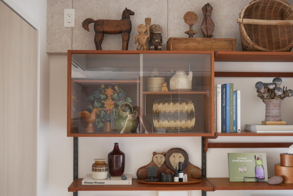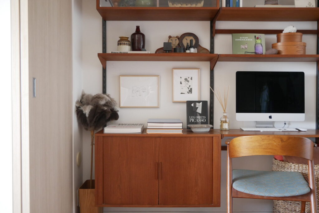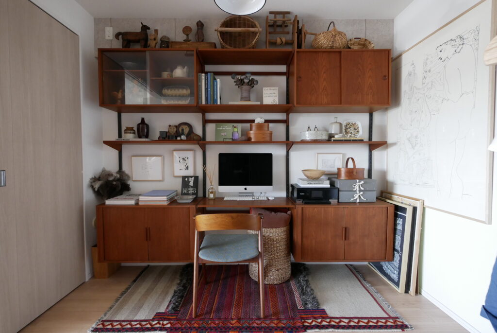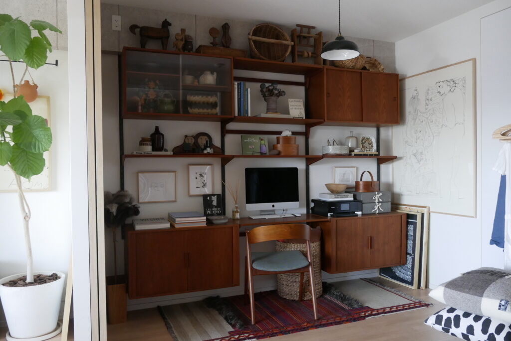 成田さん:このカイ・クリスチャンセンのウォールシェルフは、僕も北欧に買付で行ったときに絶対に見つけられず国内でよく当時買えたなという一品だと思っていて、一列だけのユニットはよく見ますが、この四隅の収納がセットですべて揃っているのはかなり希少かと思います。しかも設置したいと思っていたところにジャストフィットして、これはかなり奇跡的でした。