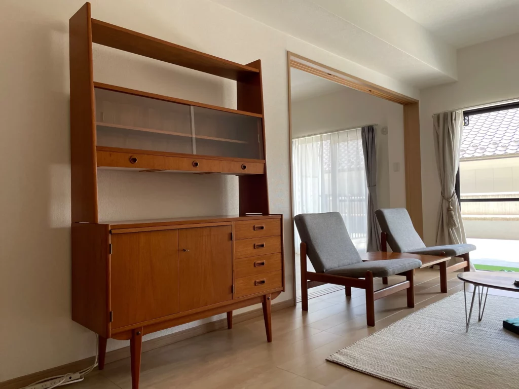 それぞれローズウッド材、チーク材、オーク材と異なる素材のお品ですがお部屋に馴染んでおり素敵なコーディネートとなりました。