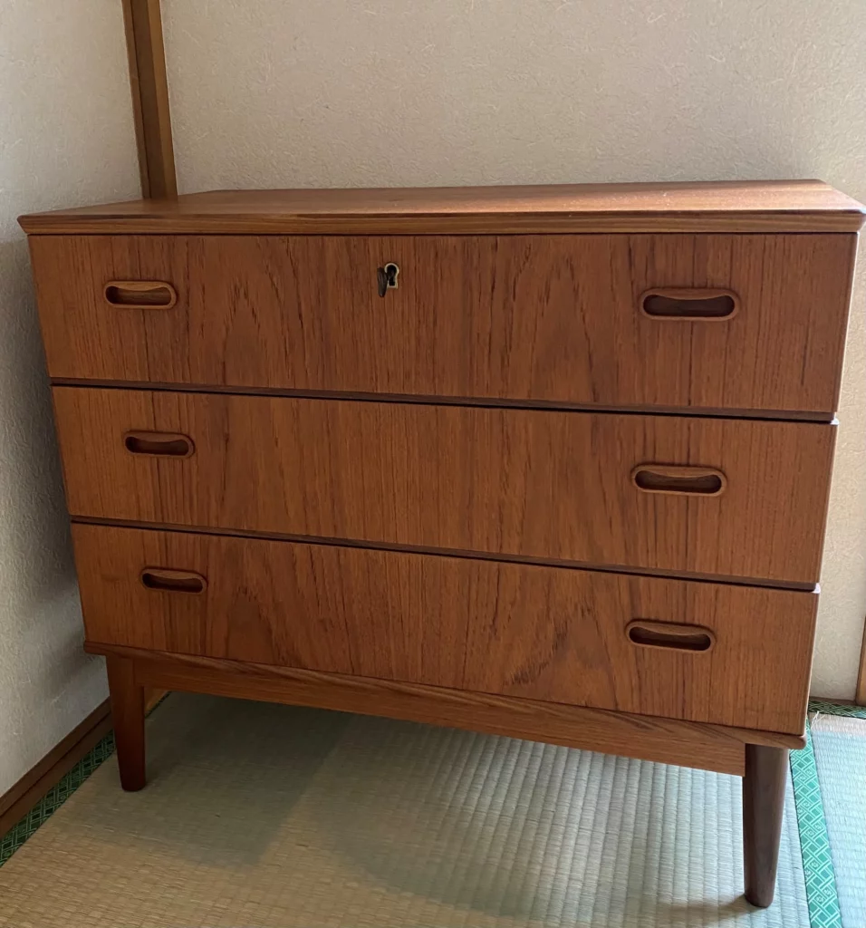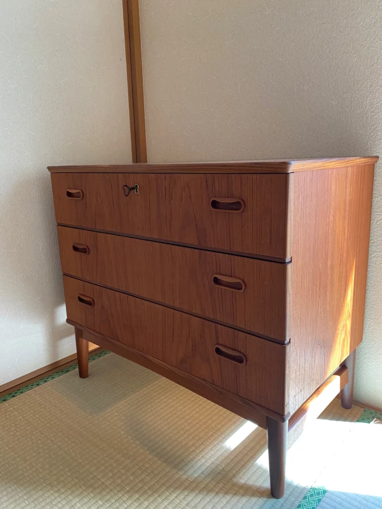 こちらのチェストはいろいろ凝った作りも魅力ですが、前板の繋がった杢目も美しい一品でした。