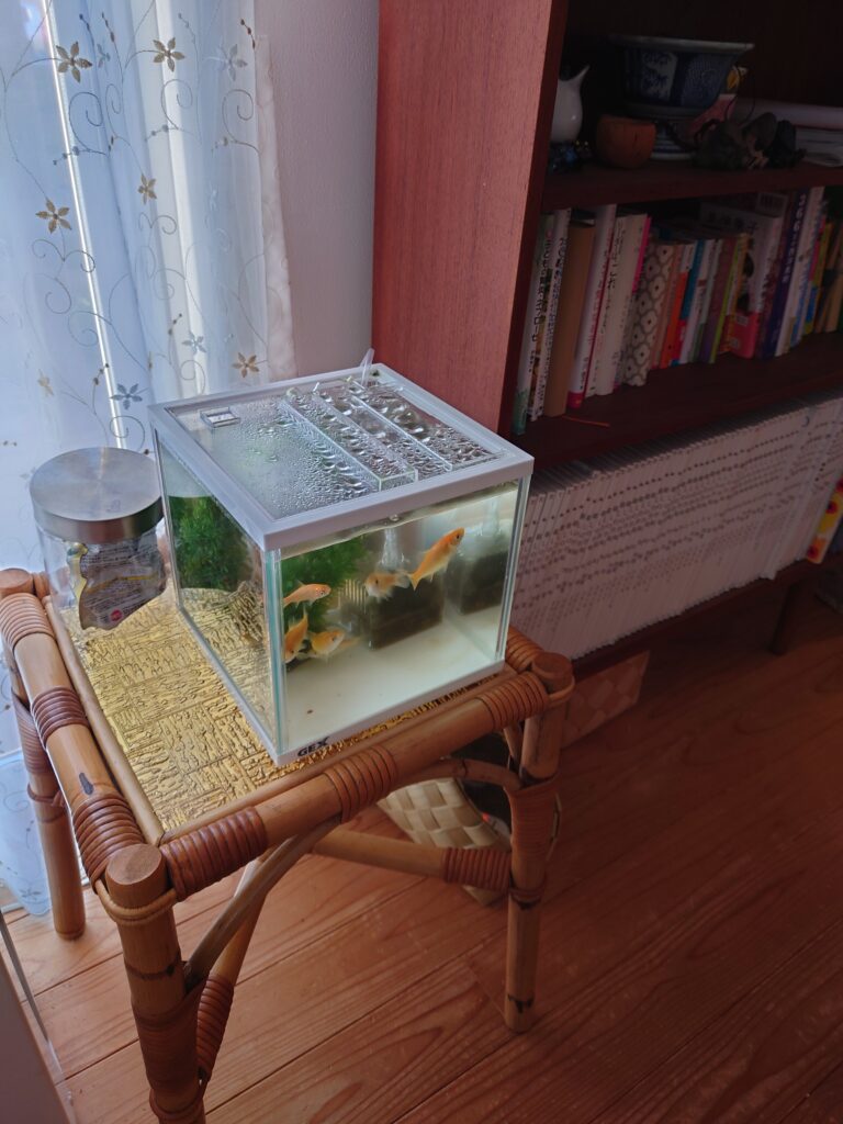 琥珀色のガラストップは日が当たるとよりきれいに美しく見えますね。心なしか金魚たちも楽しそうです。